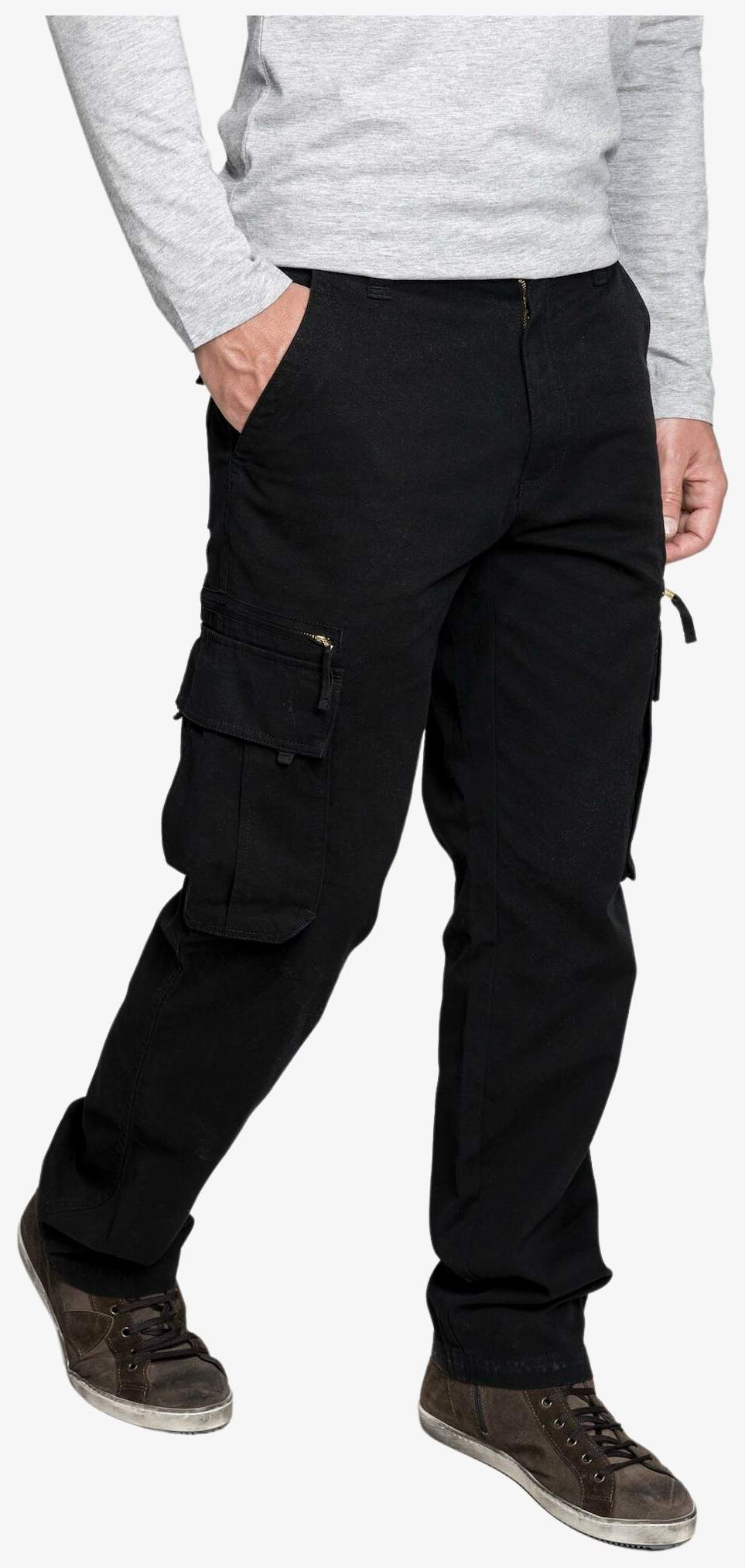 Le Pantalon multipoches homme en coton avec fermeture à glissière et bouton. 8 poches au total, dont poches côté, poches passepoilées zippées, poches plaquées à soufflet avec rabat auto-agrippant et poches arrière plaquées auto-agrippante.