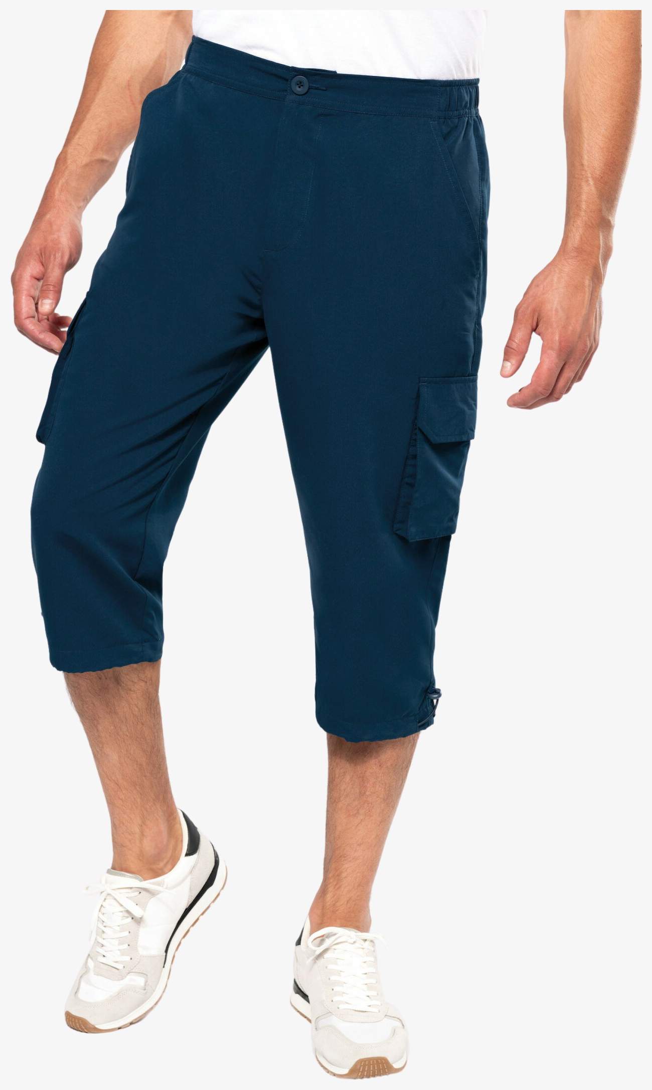 Le pantacourt loisirs est conçu en polyester microfibre avec un toucher peau de pêche et un tissu à séchage rapide. Il comprend deux poches italiennes et deux poches à soufflet avec rabat sur le côté à l'avant, ainsi que deux poches arrière fermées par bande auto-agrippante. La ceinture est élastiquée avec bouton et fermeture zippée. Le bas des jambes se règle par cordon avec stoppeur.