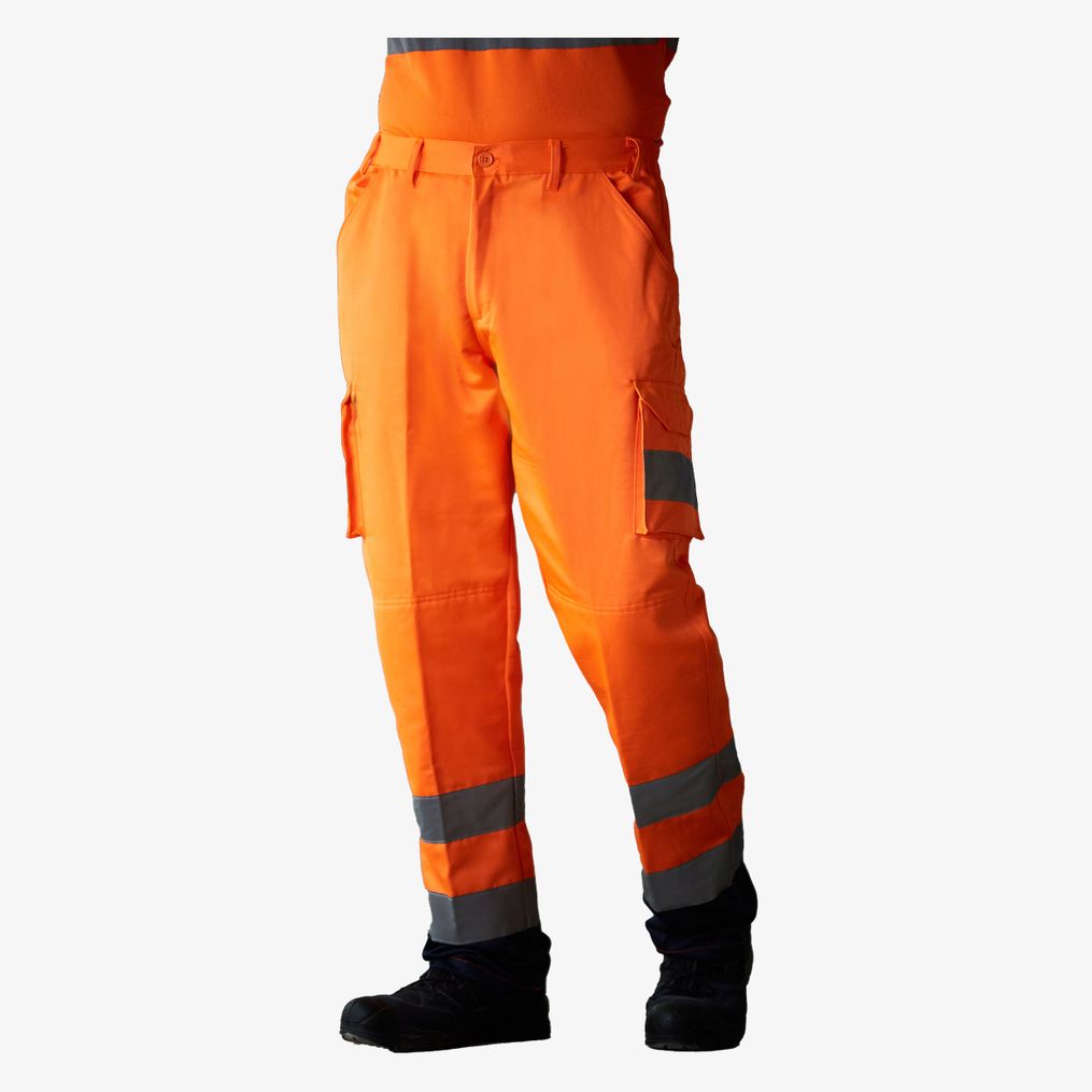 Le pantalon cargo est conçu en polyester sergé avec 80 % polyester et 20 % coton. Il dispose d'une ceinture élastique latérale avec 7 passants ceinture et d'une fermeture zippée. Ce vêtement comprend 2 poches latérales, 2 poches cargo, une poche arrière avec bande auto-agrippante ainsi que des poches internes pour genouillères. Deux bandes réfléchissantes entourent les jambes.