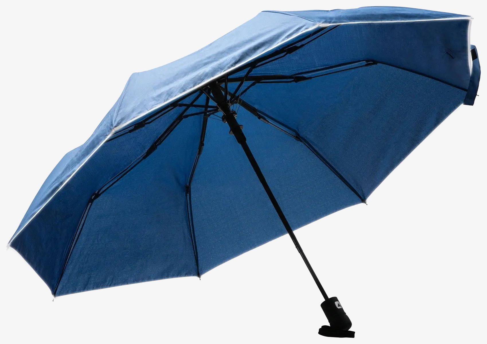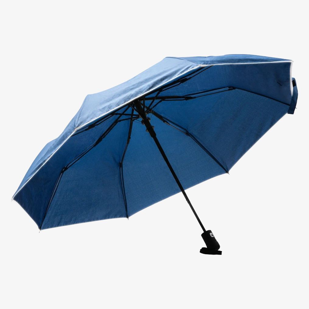 Le parapluie RPET utilise un tissu pongé 190 T déperlant avec bandes réfléchissantes augmentant la visibilité en faible lumière. Les tiges en fibre de verre équipées d'un système anti-vent offrent flexibilité et résistance aux rafales. L'ouverture automatique facilite son usage, la fermeture par bande auto-agrippante sécurise le rangement. Une housse assortie accompagne le parapluie pour stockage.