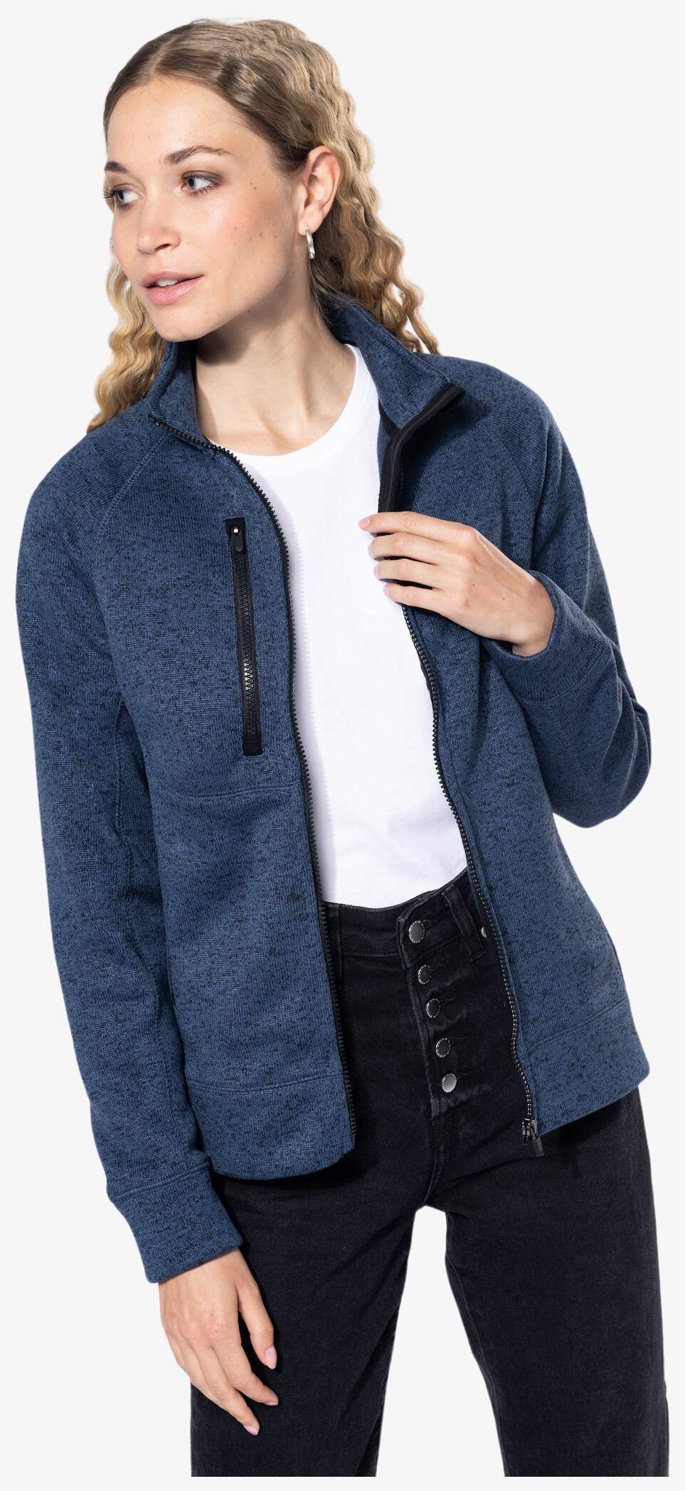 La veste zippée chinée pour femme est conçue en polyester avec un tricot intérieur gratté. Elle comporte des manches raglan et une fermeture zippée centrale. Trois poches zippées sont intégrées, dont deux à l'avant et une à la poitrine.