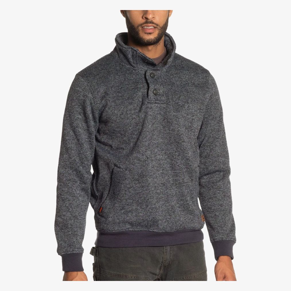 Pull polaire tricoté. Col avec boutons-pression. 2 poches latérales avec glissières. Poignets et bas tricotés en côte. Pièces renforcées au niveau des coudes. Composition : extérieur 100 % polyester ; renforcement coudes 88 % polyester, 10 % élasthanne, 2 % viscose. Grammage : 380g/m²