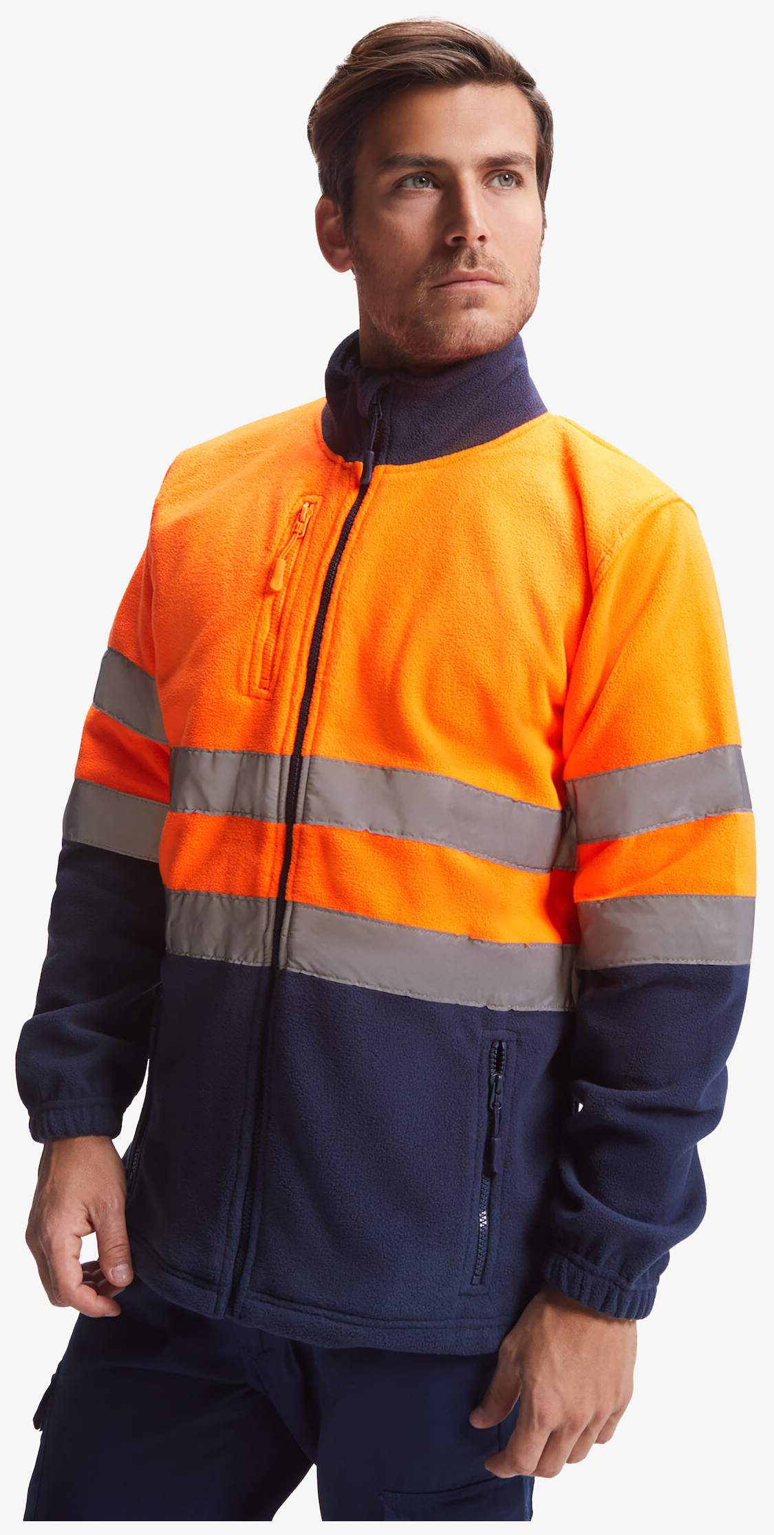 La veste polaire 100 polyester présente une fermeture zippée avec protège-menton, deux bandes réfléchissantes horizontales sur le torse et les manches, ainsi que deux poches avant zippées ton sur ton et une poche poitrine. Les poignets sont élastiques avec ajusteurs à l'intérieur de l'ourlet.