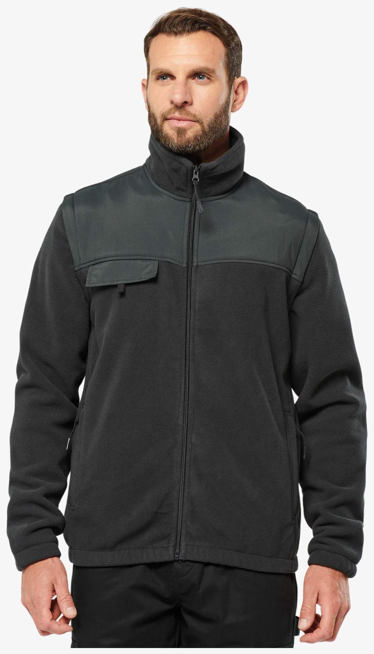 La veste polaire manches amovibles pour homme combine un extérieur en polaire et des renforts en taslon pour une résistance accrue. Les manches doublées polyester sont amovibles, offrant une adaptabilité selon les besoins. La veste comprend deux poches avant zippées et une poche poitrine avec rabat à bande auto-agrippante.