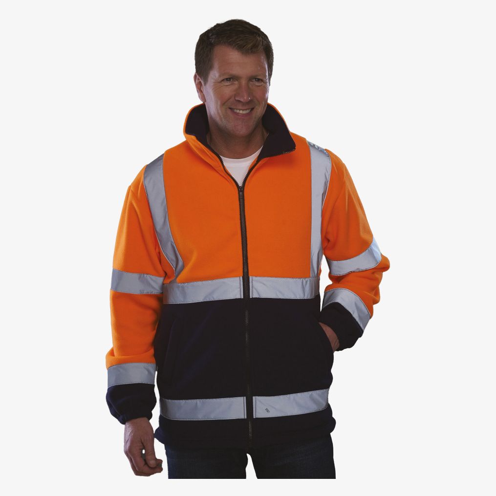 La veste polaire haute visibilité est conçue en polyester avec des bandes réfléchissantes autour du corps et sur les épaules pour une meilleure visibilité. Elle dispose d'un zip intégral à l'avant, de poignets élastiqués et de deux poches inférieures passepoilées. Le col montant apporte une protection supplémentaire.