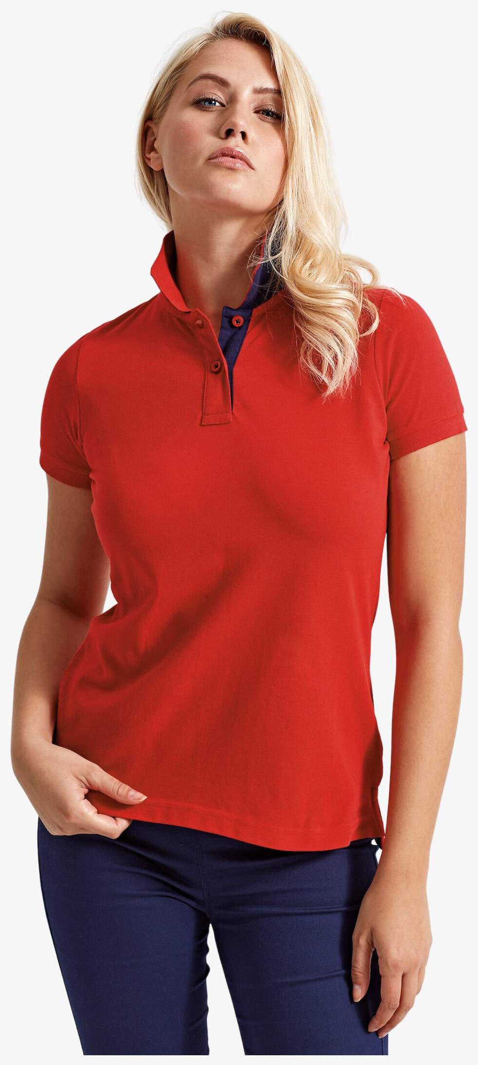 Le polo cintré pour femme comprend un col patte contrasté et deux boutons de couleur assortie. Les fentes latérales sont aussi contrastées. L'ourlet est réalisé avec des coutures à aiguille double. Le col et les poignets sont en tricot côtelé. L'étiquette intérieure contient des informations sur le produit.