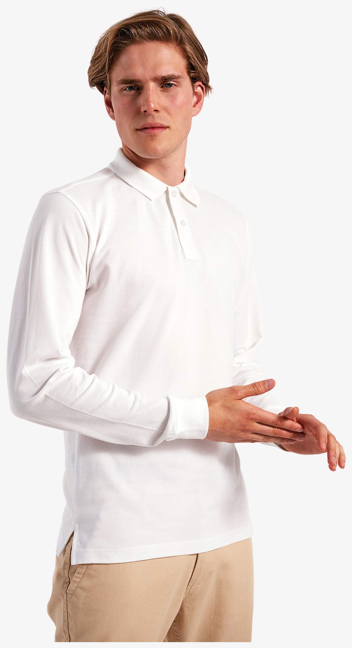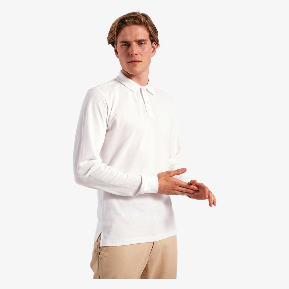 Le polo manches longues homme est doté de poignets col tricot, d'une patte boutonnage à deux boutons et de fentes latérales. Sa conception utilise du coton peigné à fil chaîne continu.