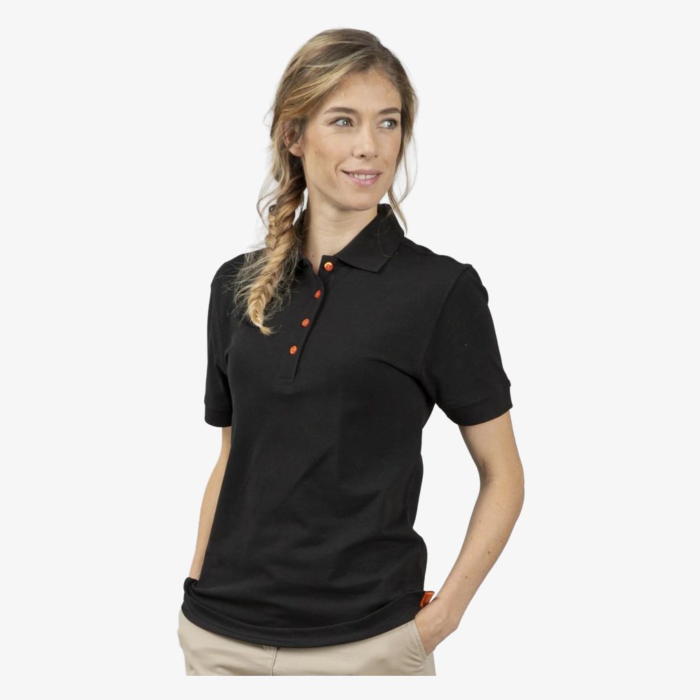 Le polo femme présente des boutons contrastés et une bande propreté contrastée au col. Il dispose d'un bord côte aux manches et col ainsi que d'une plaquette à 4 boutons.