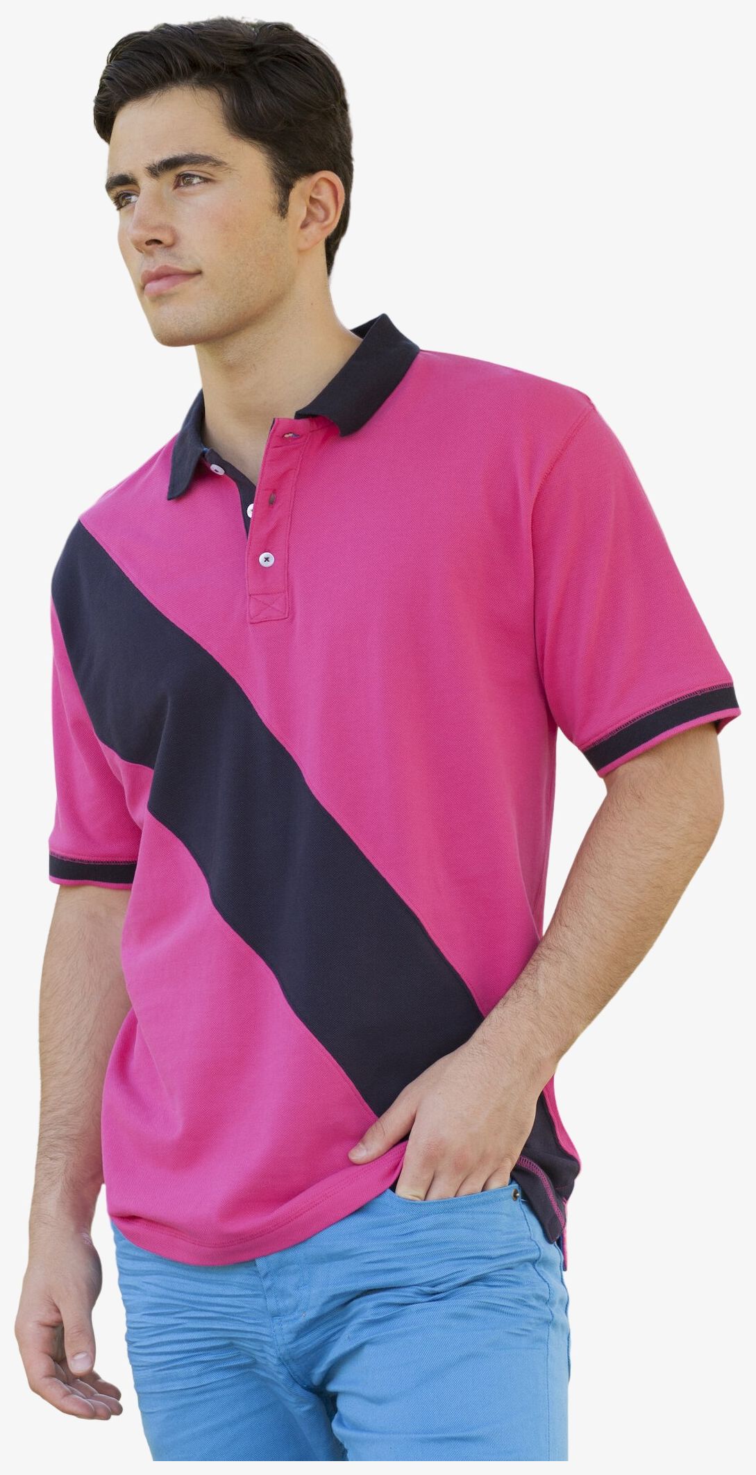 Polo piqué avec rayure diagonale. Pas d'étiquette indiquant la marque. Coupe légèrement slim. 3 boutons de fermeture au niveau du col , boutons nacrés. Manches et col légèrement contrastés. 100% coton Grammage : 200g/m²