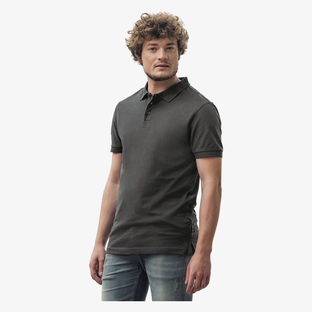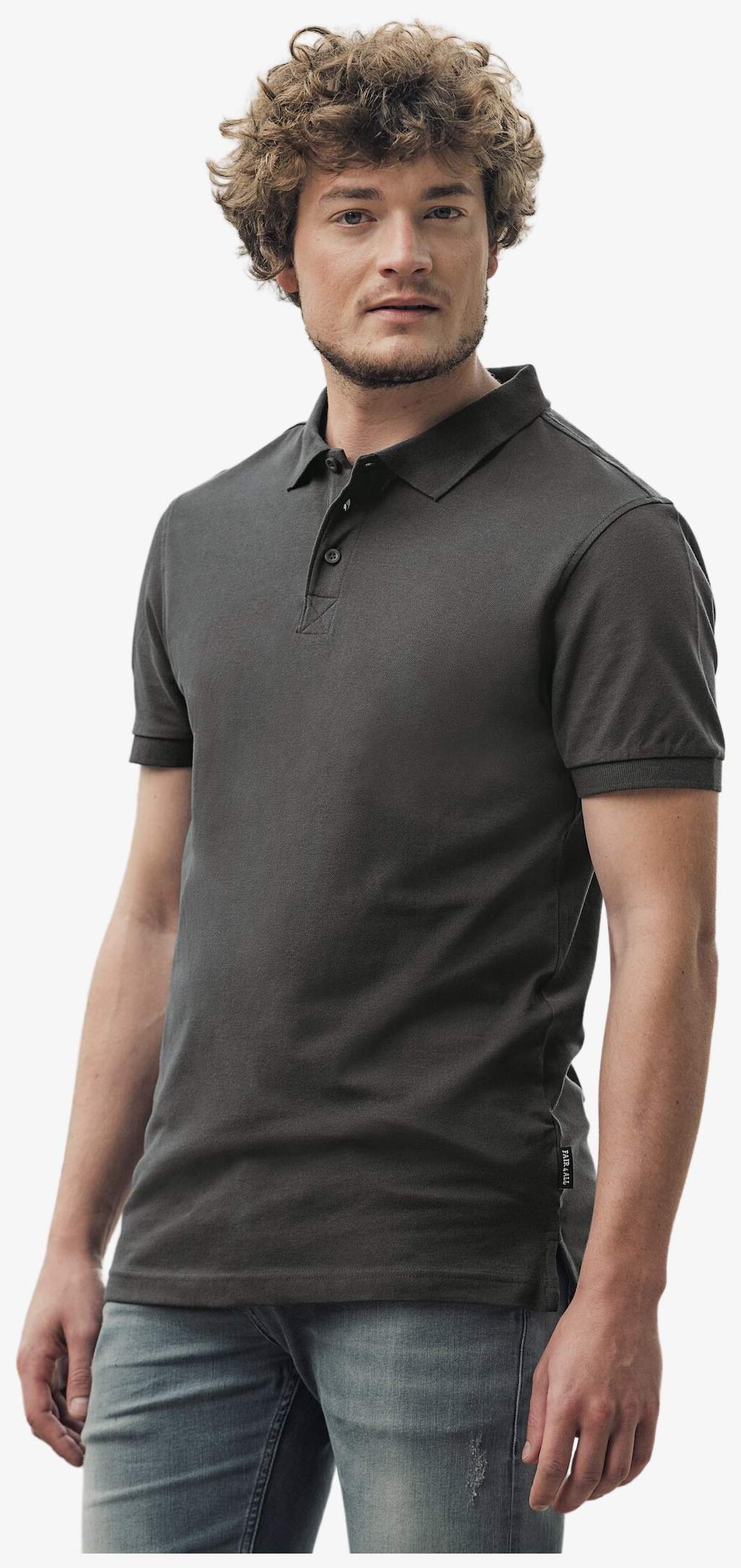 Le Men's Heavy Stretch Polo est conçu en double maille piquée filée à l’anneau avec une coupe étroite moderne. Il comporte un tour de cou avec fentes latérales renforcées et des extrémités de col et manches en tricot côtelé 1x1. La patte de boutonnage comprend 3 boutons ton sur ton. Le polo est sans étiquette, avec une étiquette tissu Fair4All dans la couture gauche. Il est prétraité contre le rétrécissement et les bouloches.