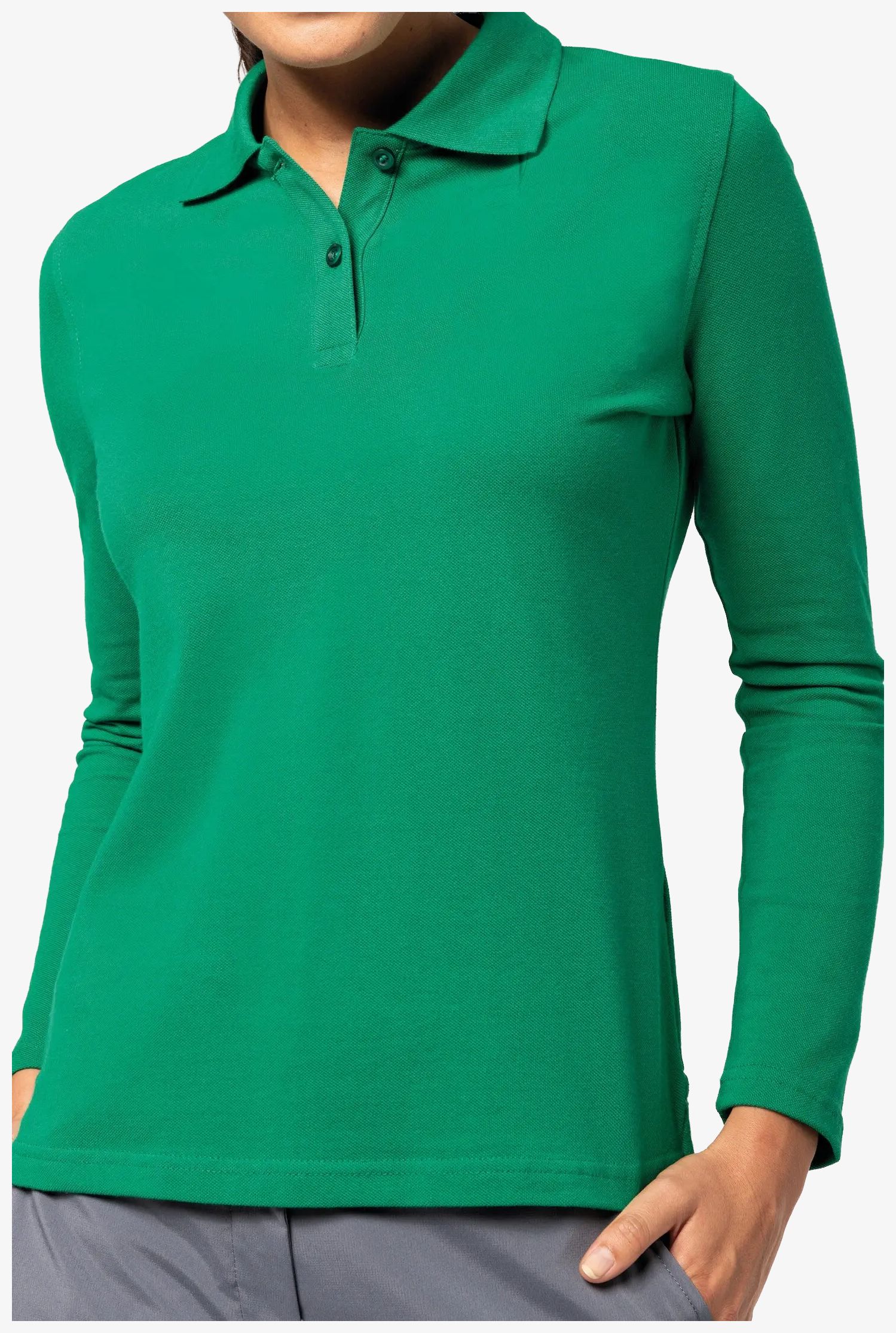 Le Polo manches longues femme convient à un usage quotidien, avec maille piquée, col bord-côte et patte de boutonnage à 2 boutons. Bande de propreté à l'encolure et fentes côtés contrastées.