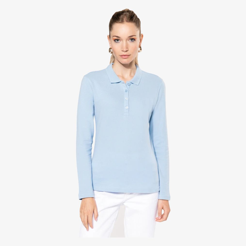 Le polo manches longues femme est conçu en coton piqué pré-rétréci (Oxford Grey : 90% coton / 10% viscose) avec une coupe cintrée. Il dispose d'un col bord-côte 1x1, d'un ourlet au bas des manches et d'une patte de boutonnage à 4 boutons ton sur ton. Une bande de propreté ton sur ton est présente à l'encolure avec des fentes latérales.
