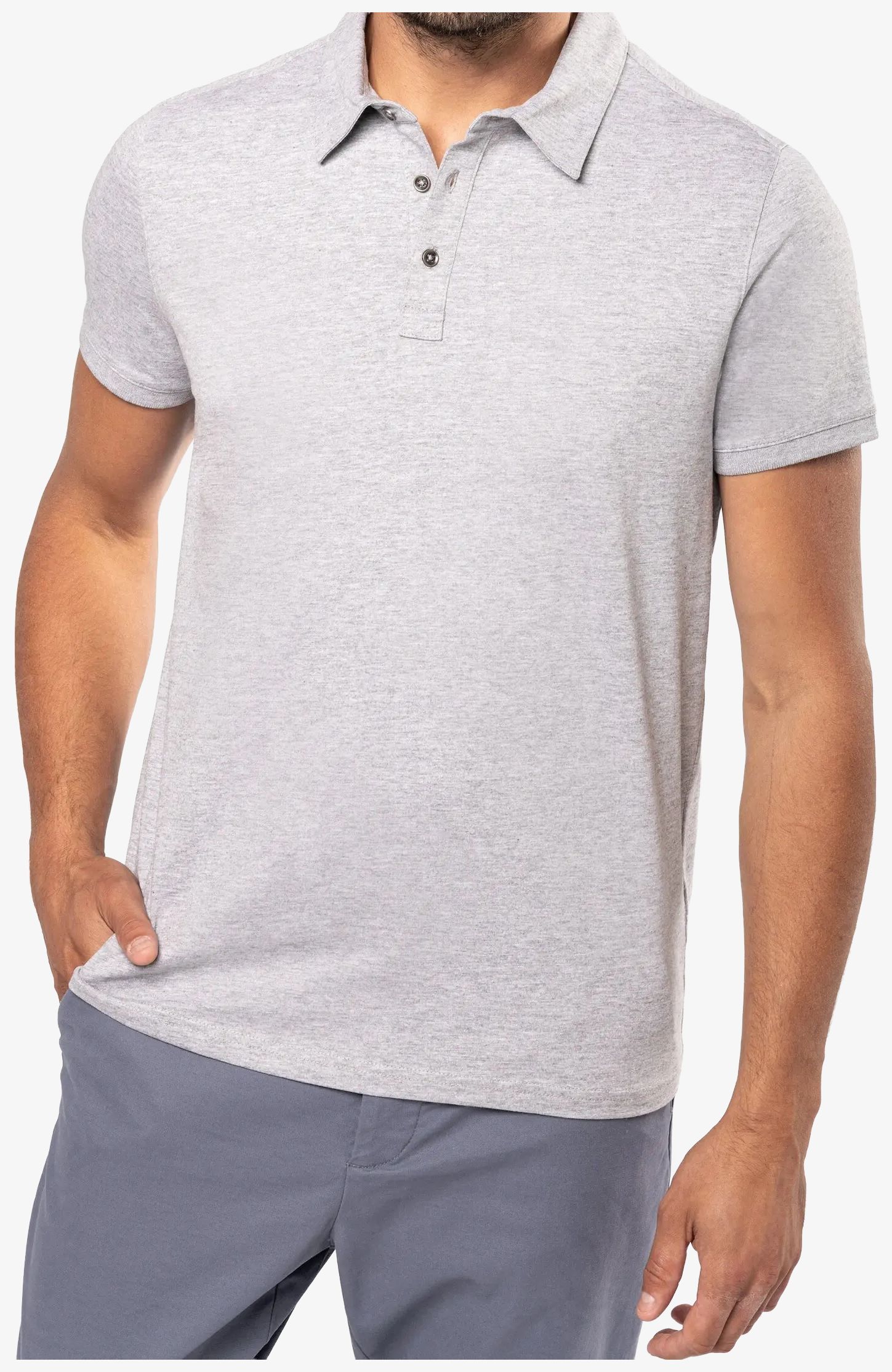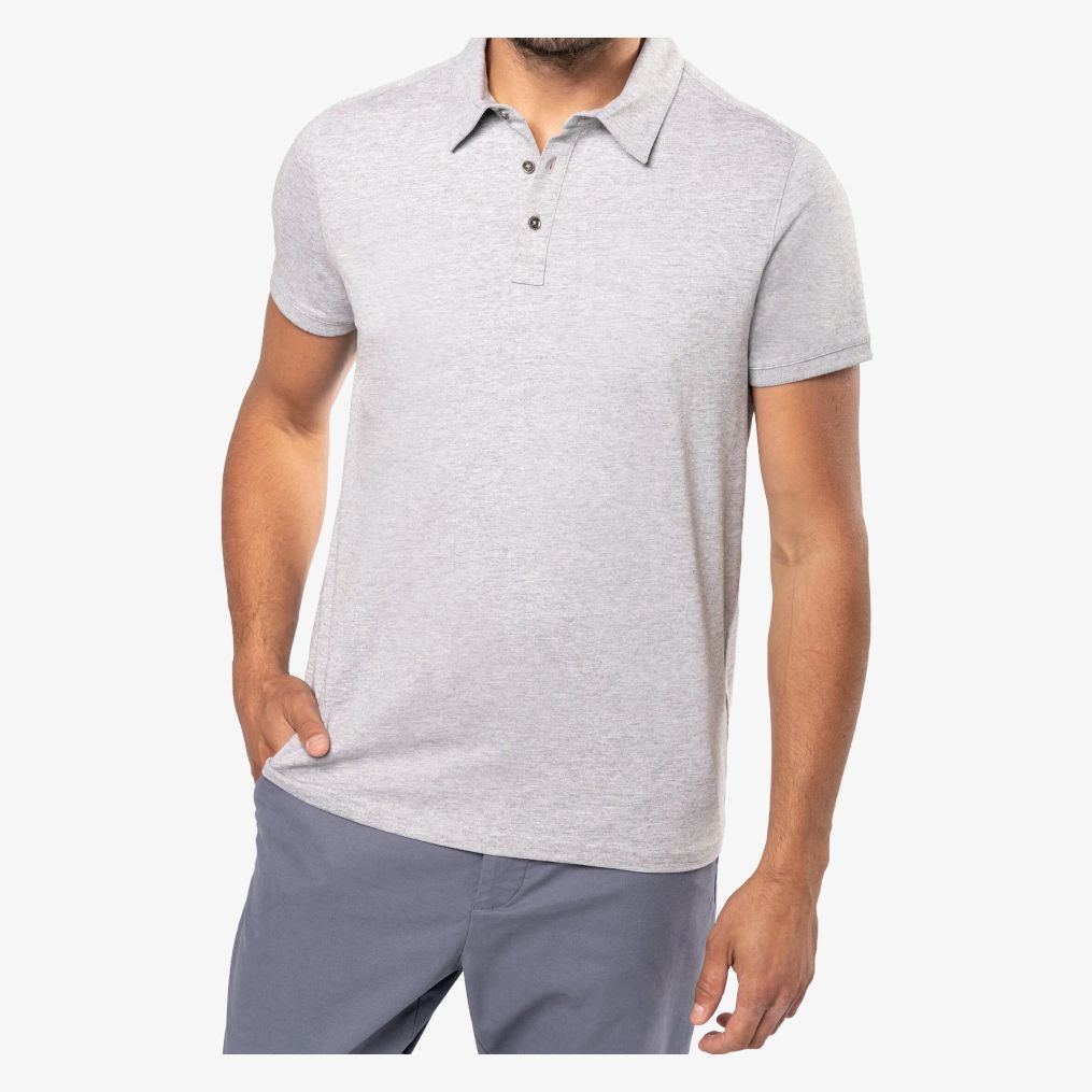 Le polo jersey manches courtes homme est conçu en maille jersey avec col chemise et patte de boutonnage 3 boutons métal. Il comporte un empiècement épaule et une finition bord-côte au bas des manches. La double aiguille est présente au bas du vêtement.