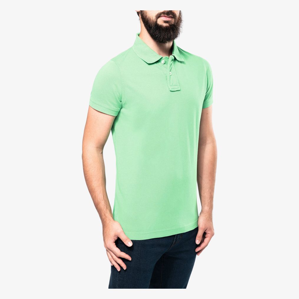 100% coton piqué - Maille piquée - Toucher peau de pêche et aspect "Vintage" - Col en bord-côte - Bande de propreté fantaisie à l'encolure et fentes côté - Large patte de boutonnage 2 boutons contrastés - Finition double aiguille bas de vêtement et bord côte au bas de manche - Grammage : 220g/m²