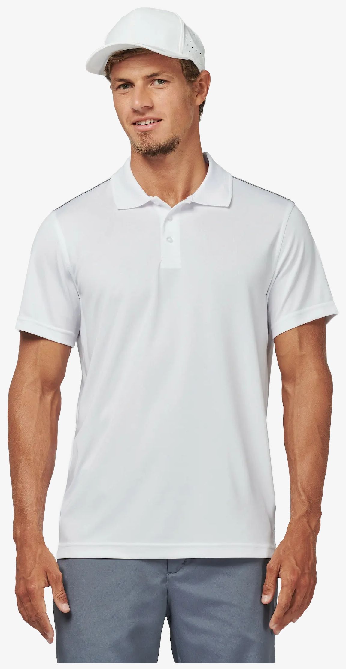 Le polo manches courtes est conçu en polyester interlock avec un tissu à séchage rapide. Il possède un col bord-côte, une patte de boutonnage à 3 boutons, ainsi qu'une bande propreté contrastée à l'encolure et des fentes côtés. Le passepoil contrasté aux épaules complète sa structure.