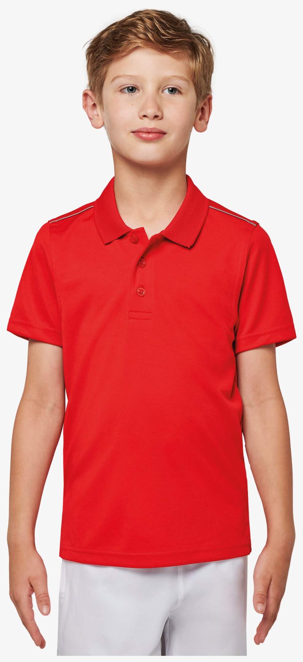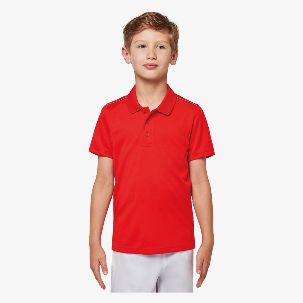 Le polo manches courtes enfant est conçu en polyester interlock avec un tissu à séchage rapide. Il comprend un col bord-côte, une patte de boutonnage 3 boutons, une bande propreté contrastée au col sur les fentes latérales et un passepoil contrasté aux épaules.