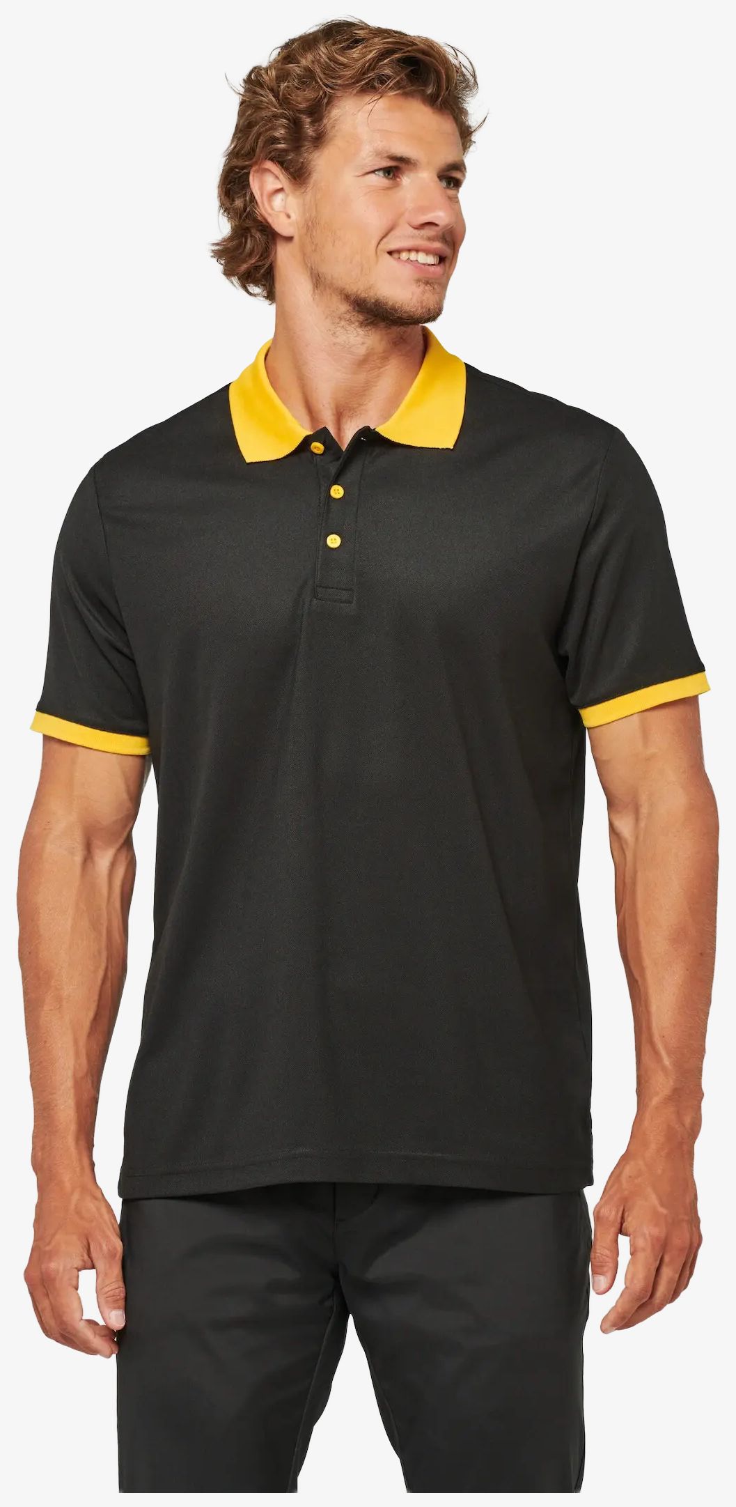 Le polo piqué performance homme est conçu en maille piquée Cool Plus® 100% polyester avec tissu à séchage rapide. Il présente une coupe ajustée au style moderne, un col bas et des manches bord-côte contrastés. La patte de boutonnage comprend 3 boutons contrastés et le vêtement dispose de fentes latérales.