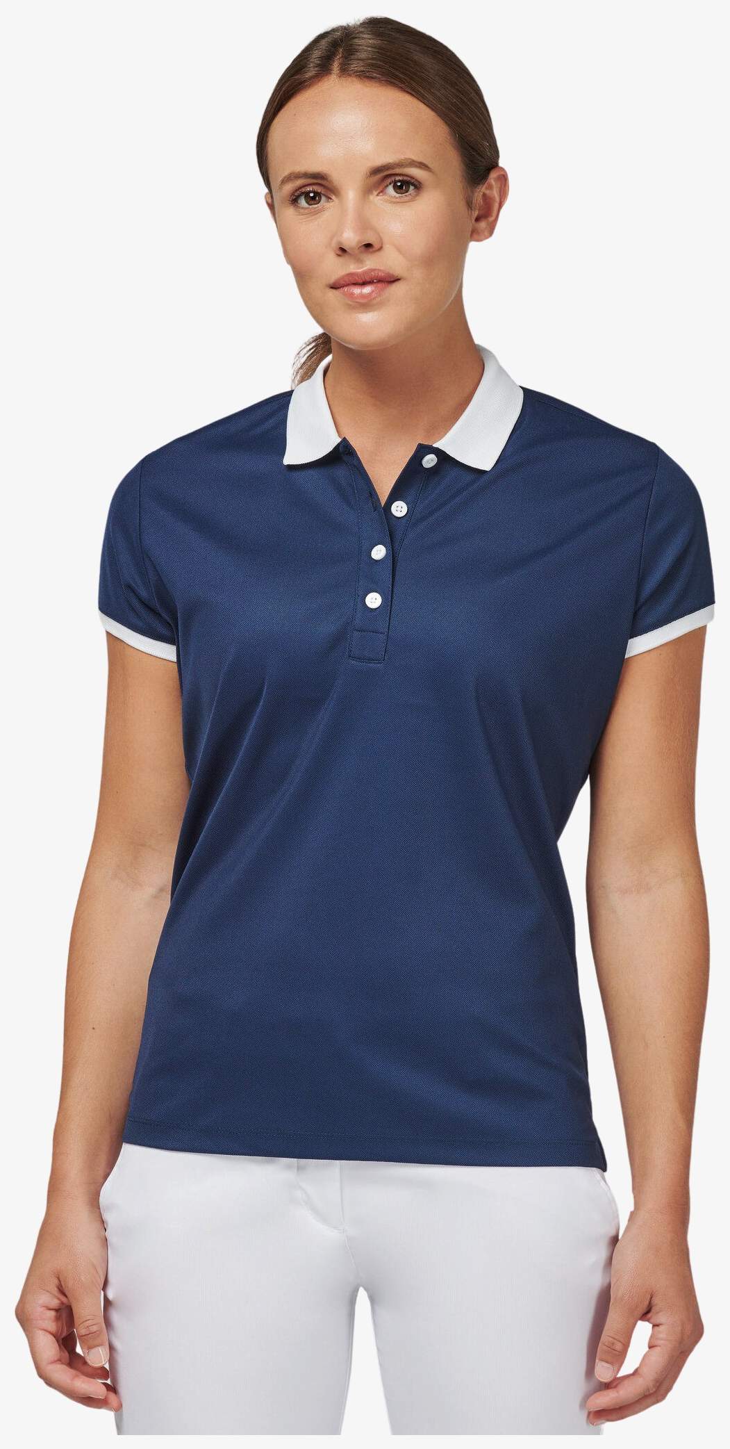 Le polo piqué performance femme est conçu en maille piquée Cool Plus® 100% polyester avec tissu à séchage rapide. Il présente une coupe cintrée et un col bas avec bord-côte contrasté. La patte de boutonnage comporte 4 boutons contrastés. Des fentes latérales complètent la structure.