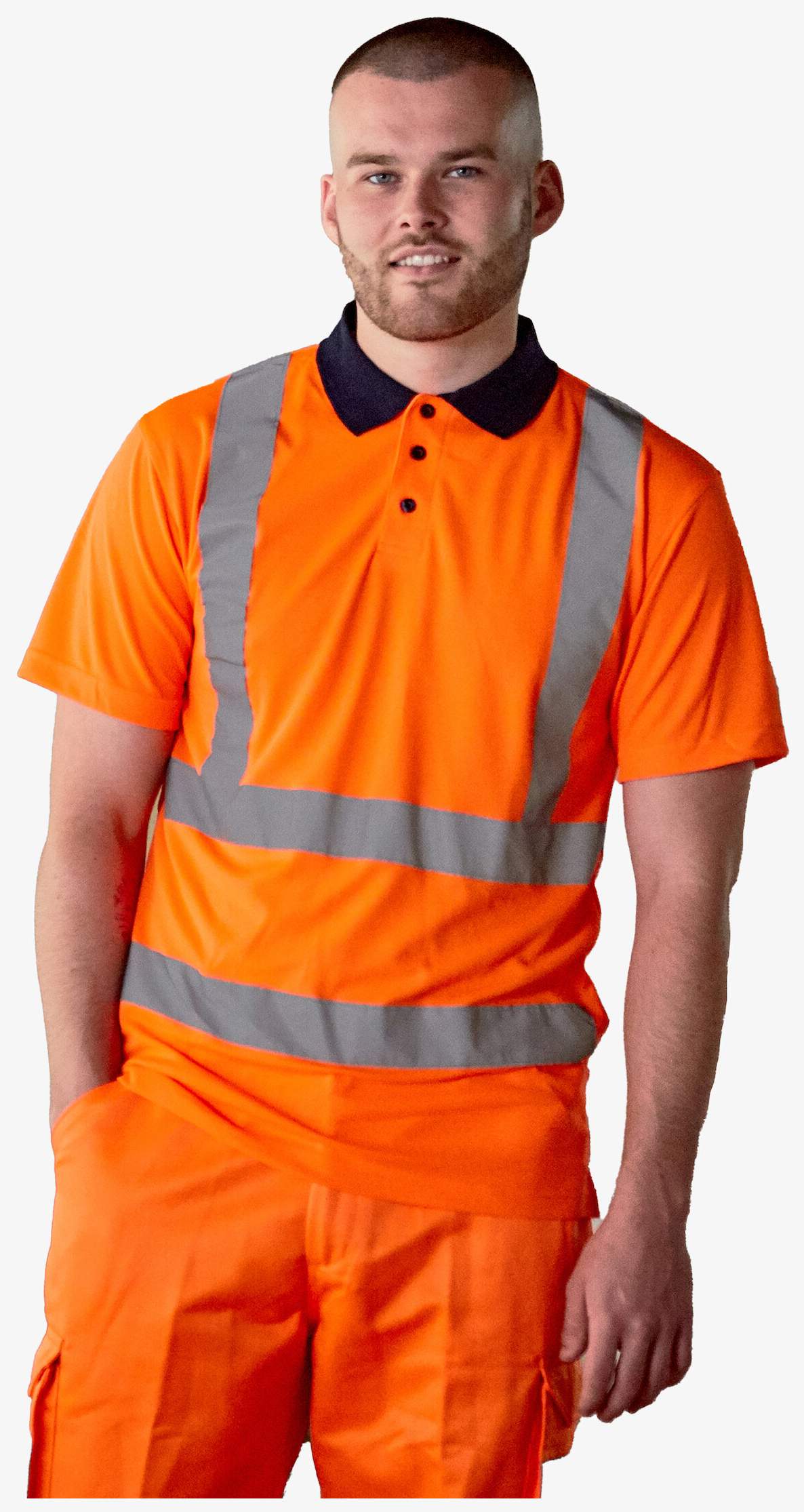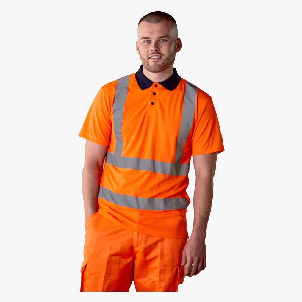 Le polo à visibilité renforcée est conçu en polyester avec bandes réfléchissantes pour un usage professionnel. Il comporte un col côtelé de couleur contrastée et une patte boutonnage à trois boutons avec un bouton de rechange. Les surpiqûres doubles sont présentes sur les épaules et les ourlets des manches. Des fentes latérales sont intégrées à la couture.