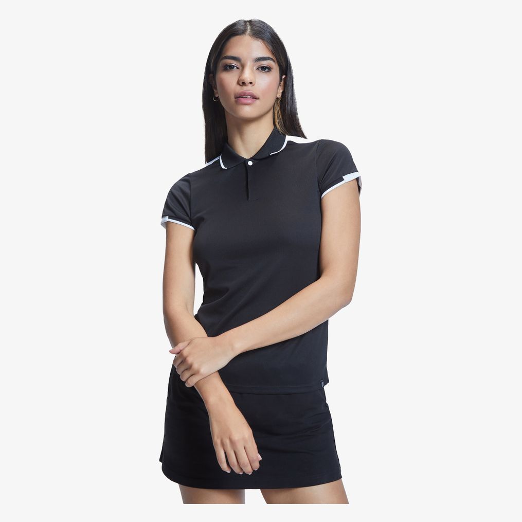 Le polo technique ajusté à manches courtes pour femme est conçu en polyester recyclé antibactérien. Il comprend un col côte 1x1, des coutures renforcées couvertes au col et une patte de boutonnage avec deux boutons dont un dissimulé. Les épaules présentent des finitions contrastées et l'ourlet est équipé de fentes latérales.