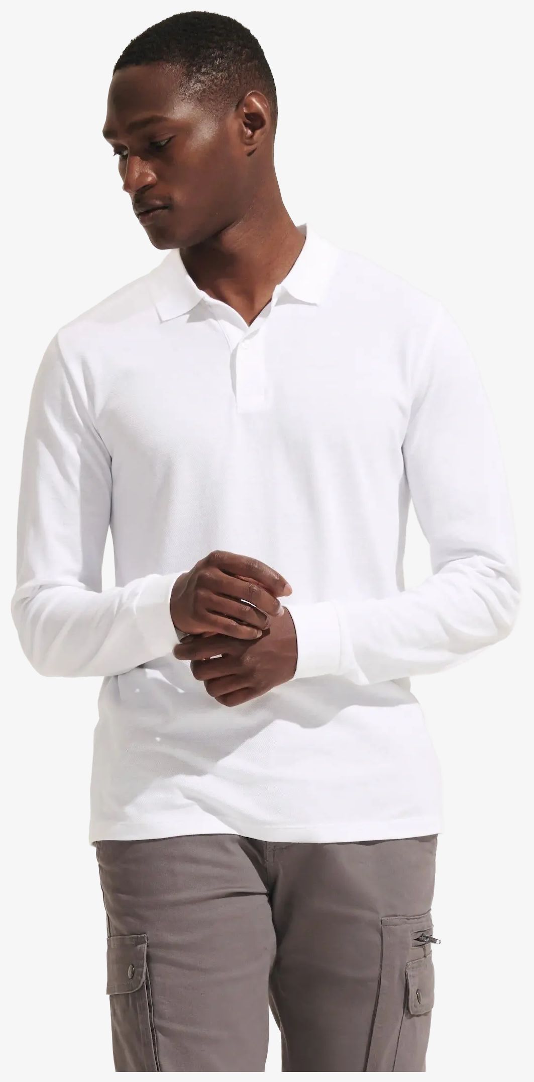 Le polo unisexe manches longues comprend un col côte avec bande de propreté, une patte renforcée avec deux boutons ton sur ton et des manches longues avec bord côte 1x1 aux poignets. Le modèle est coupé cousu et dispose d'un bouton de rechange sur la couture intérieure côté. La composition varie selon la couleur : gris chiné contient 85 % coton issu de l'agriculture biologique et 15 % viscose, anthracite chiné contient 60 % coton bio et 40 % polyester recyclé.