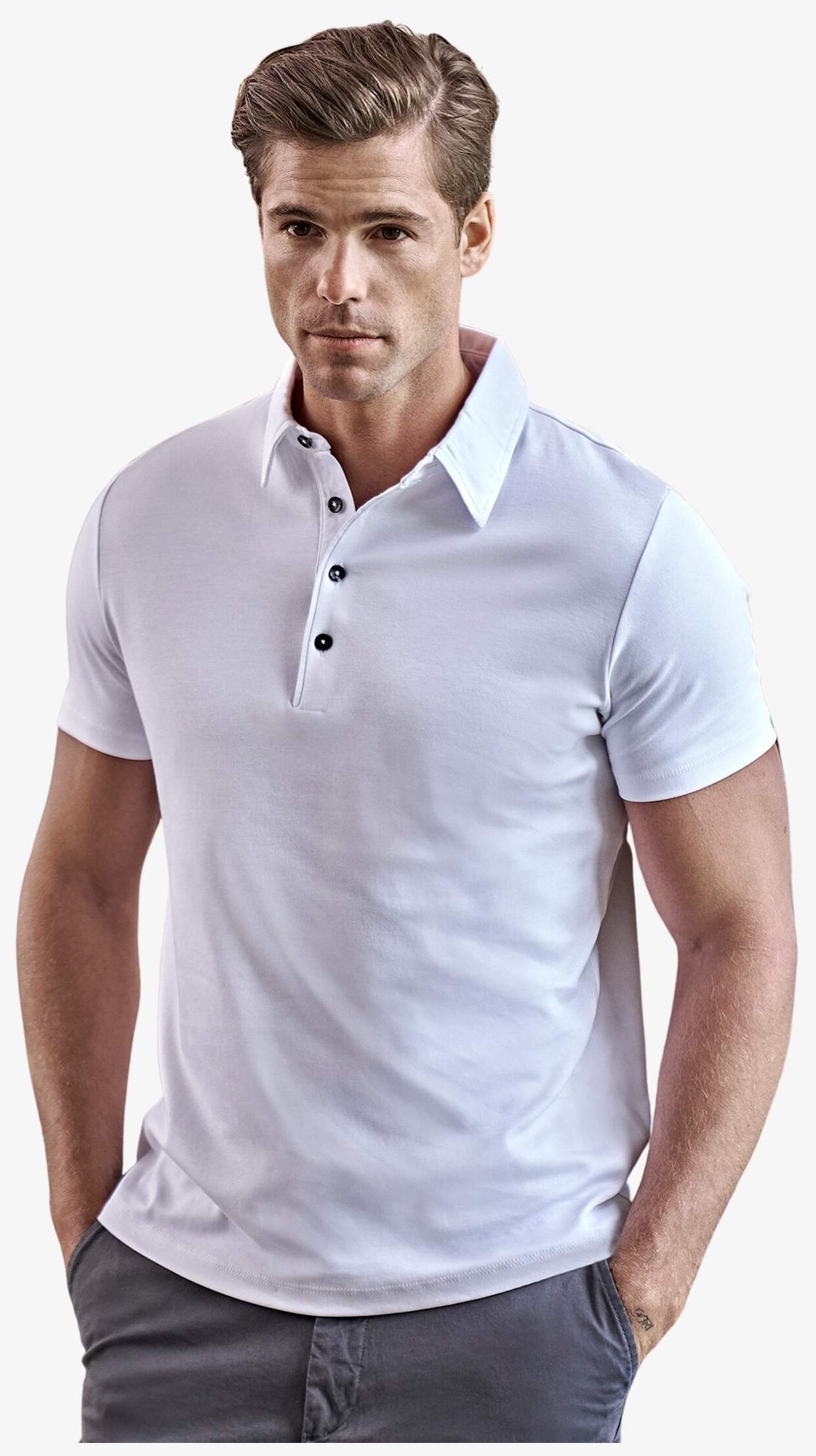 Le polo coton Pima homme est confectionné en maille piquée avec une coupe ajustée et un col en coton. Il comprend une plaquette 4 boutons anthracite perle imitation et des renforts d'épaule. Le tissu est pré-rétréci deux fois.