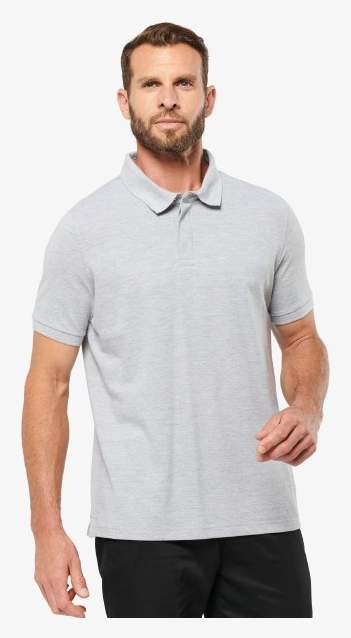 Le polo col boutons pression manches courtes homme est conçu avec un col bord-côte et une patte de boutonnage à 3 boutons pression. Il présente des manches courtes avec bord-côte et des fentes latérales pour la mobilité. La finition double aiguille au bas apporte une tenue renforcée. Le tissu est une maille piquée de coton peigné.