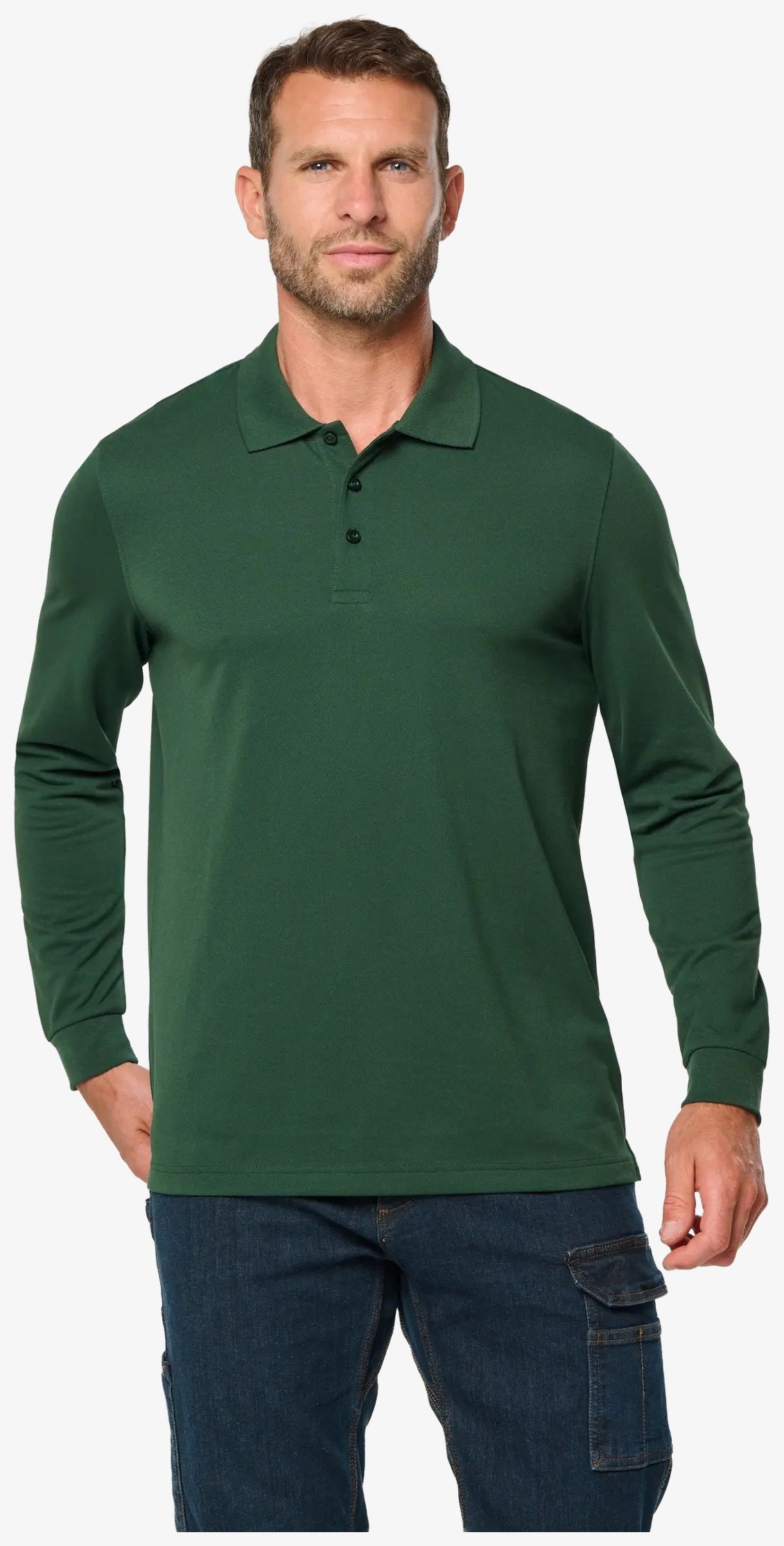 Le polo manches longues combine coton peigné et polyester en maille piquée avec traitement antibactérien et anti boulochage. Il dispose d'une patte de boutonnage col 3 boutons ton sur ton et d'un col bord-côte avec bande propreté contrastée. La finition comprend un bord-côte aux manches, fentes latérales avec bande contrastée pour plus de confort et une finition double aiguille au bas.