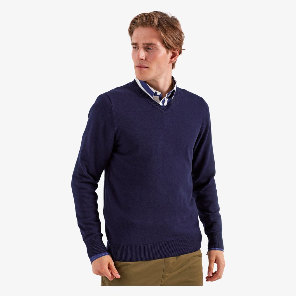 Le pull col V homme en coton mélangé présente une encolure V adaptée au port avec une chemise ou une cravate. L'arrière du cou affiche une couleur contrastée. Les finitions incluent un tricot côtelé au col, aux poignets et à l'ourlet.