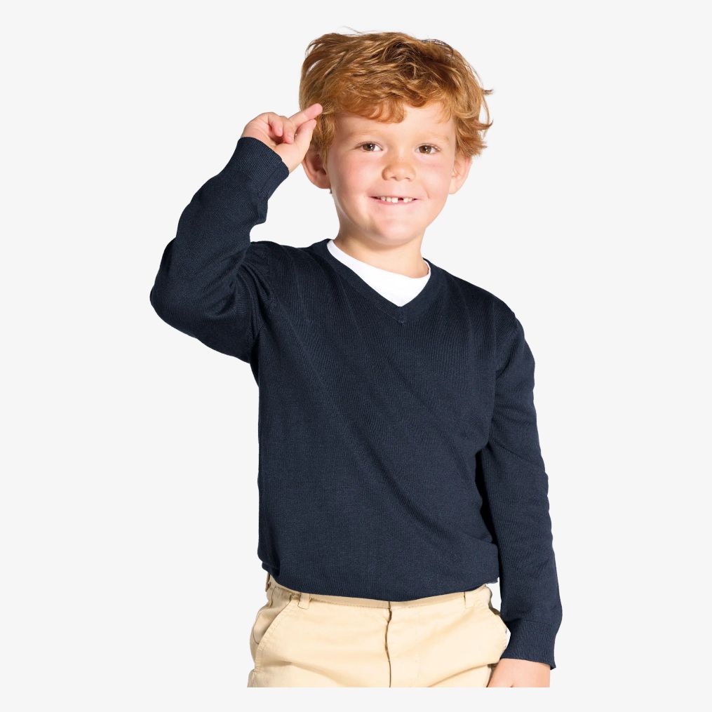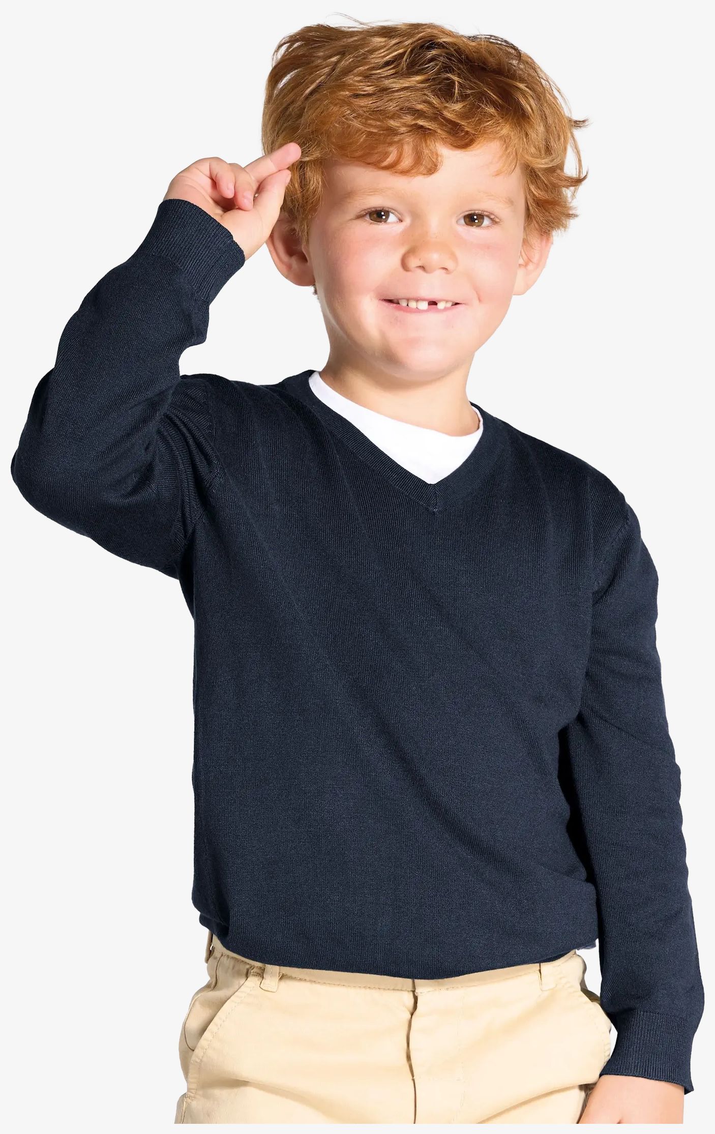 Pull col V pour enfant. Coupe ajustée. Col, poignets et ourlet côtelés. Toucher doux. Fabriqué à partir de 80% viscose et 20% nylon.