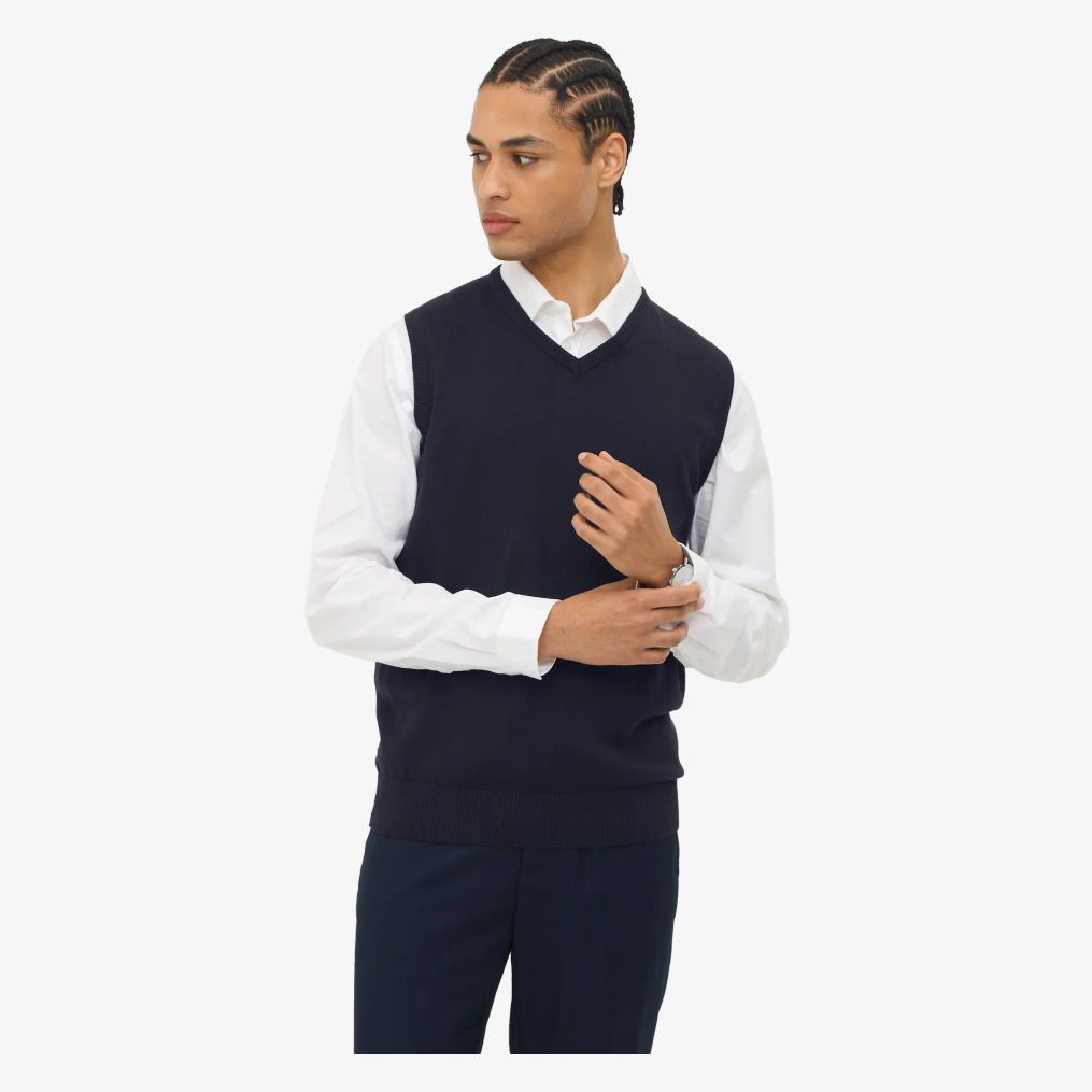 Le Gentlemen pull sans manche col V unisexe convient aux superpositions et à un usage quotidien, avec une coupe droite et des emmanchures travaillées pour une tenue régulière. Composition : 49% coton, 49% acrylique, 2% polyamide.