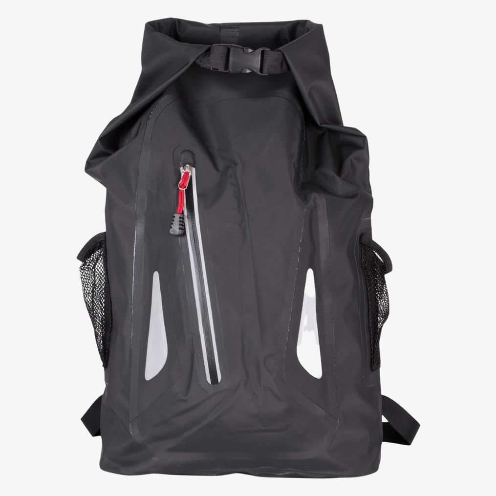 Le sac à dos étanche est conçu en toile tarpaulin PVC avec un système de fermeture roll-top. Il inclut une poche avant zippée étanche, des bretelles respirantes et une poche latérale en maille filet. Ce modèle est adapté pour les activités nécessitant une protection contre l'humidité.