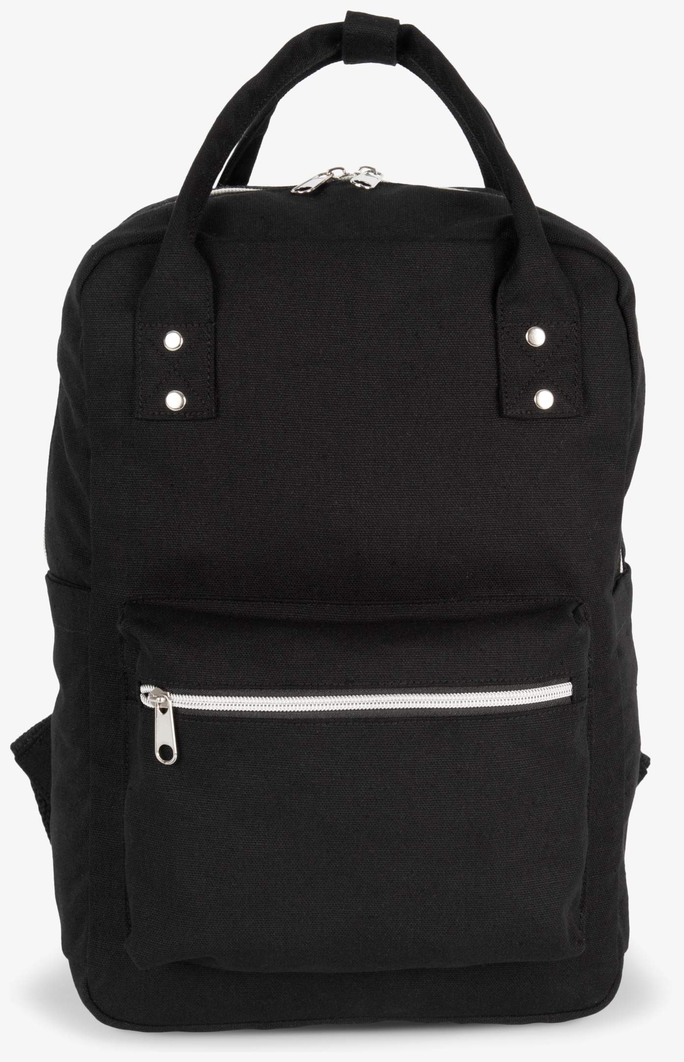 Le sac à dos style urbain en coton comprend des poignées sangles permettant une utilisation comme sac à main. Il possède une ouverture principale supérieure et une ouverture secondaire par fermetures zippées. Une poche avant zippée et des poches latérales complètent l'ensemble. Le dos et les bretelles sont matelassés pour plus de confort.