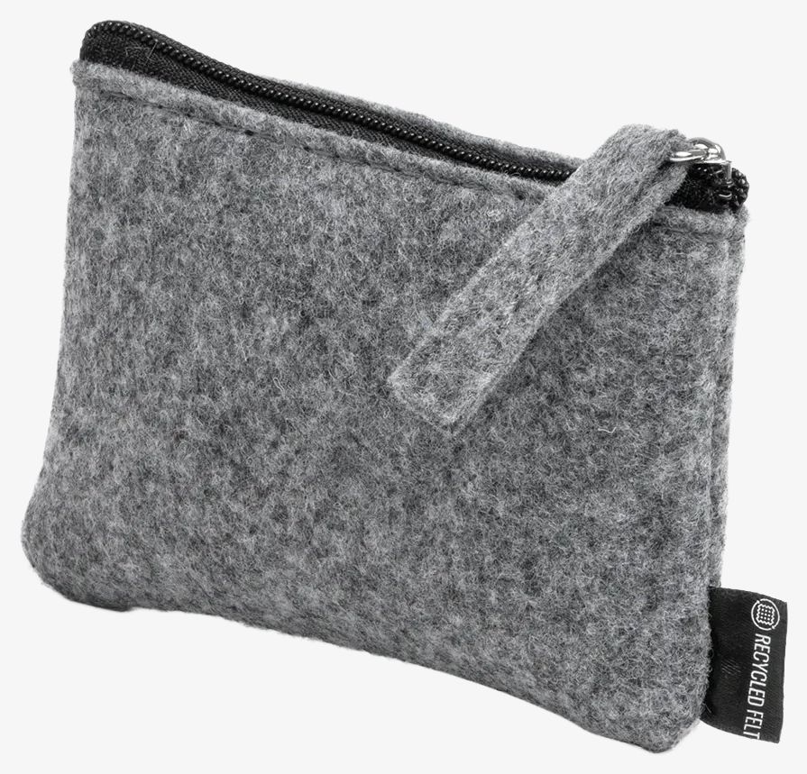 Le porte monnaie en feutre recyclé LUTON présente un design moderne avec poignée et fermoir assortis pour une ouverture et fermeture facilitées. Il permet de transporter pièces et petits objets de manière organisée grâce à un espace intérieur compact.
