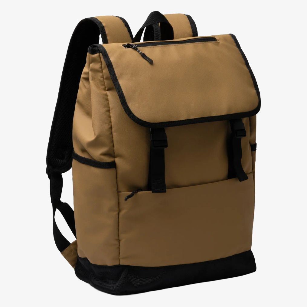 Le sac à dos avec rabat en cuir PU dispose d'un grand compartiment intérieur incluant une poche pour ordinateur portable 15 pouces. Il comporte des sangles dorsales rembourrées et plusieurs poches extérieures, dont une à rabat, une avant et des poches latérales.