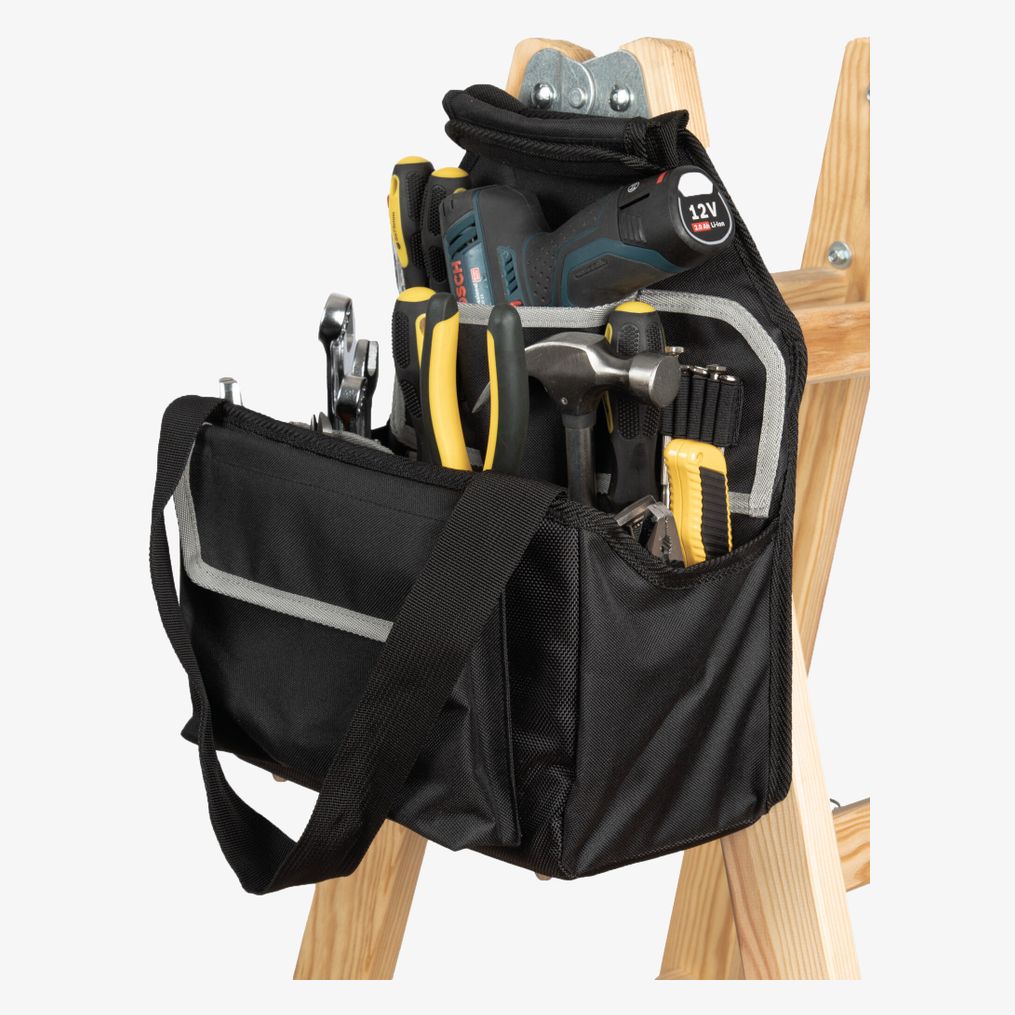 Le sac à outils adaptable aux échelles portables est conçu pour transporter des outils lors de travaux sur escabeau. Sa forme avec dos plat et poignées spécifiques facilite son usage. Il s'adapte aux échelles doubles classiques pour garder les outils à portée de main. Le large compartiment central permet de ranger des outils volumineux comme une perceuse. Les panneaux compartimentés accueillent clés et tournevis. La poche avant offre un espace pour objets.