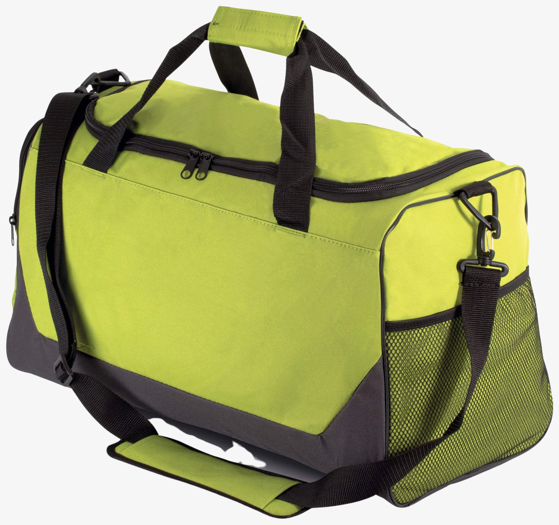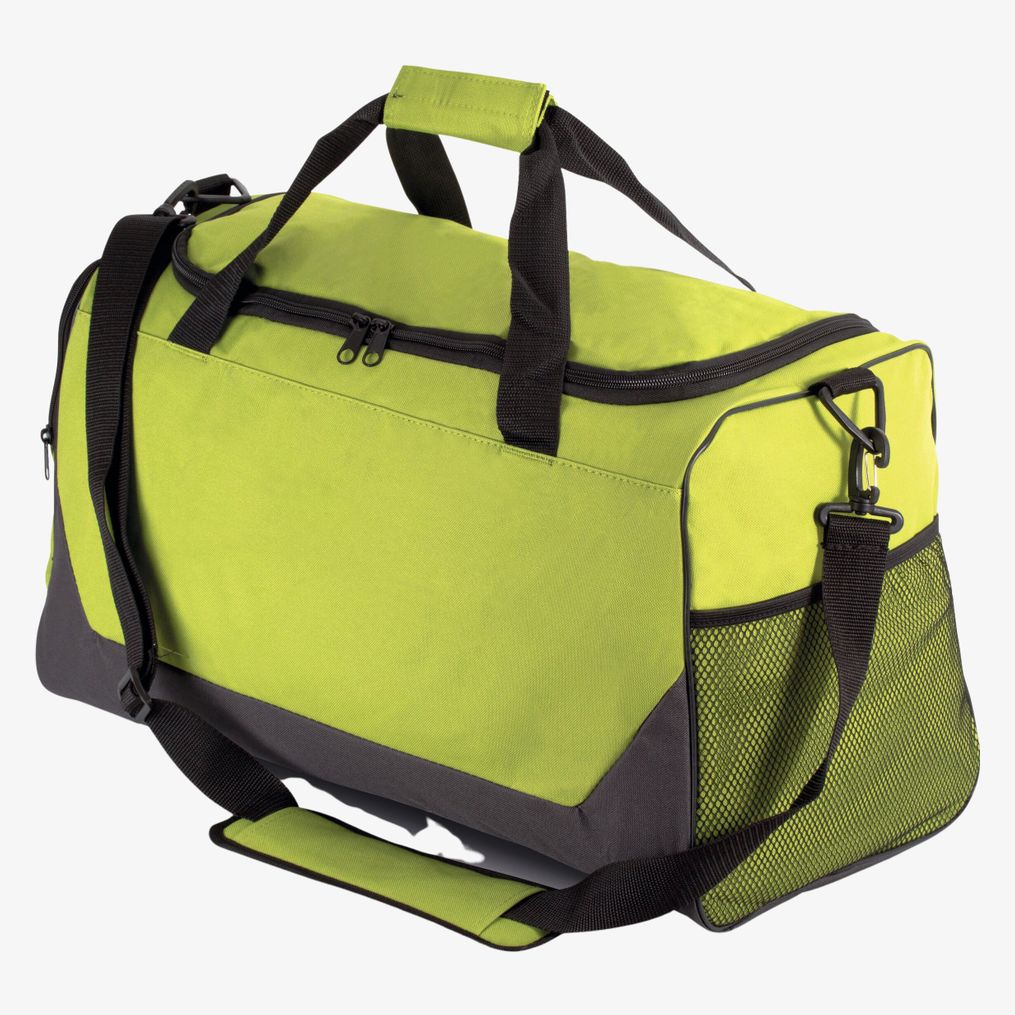 Le sac sport polyester 600D avec enduction PVC comprend deux poches latérales, une poche filet, une poche pour rangement chaussures et une lanière d'épaule amovible.