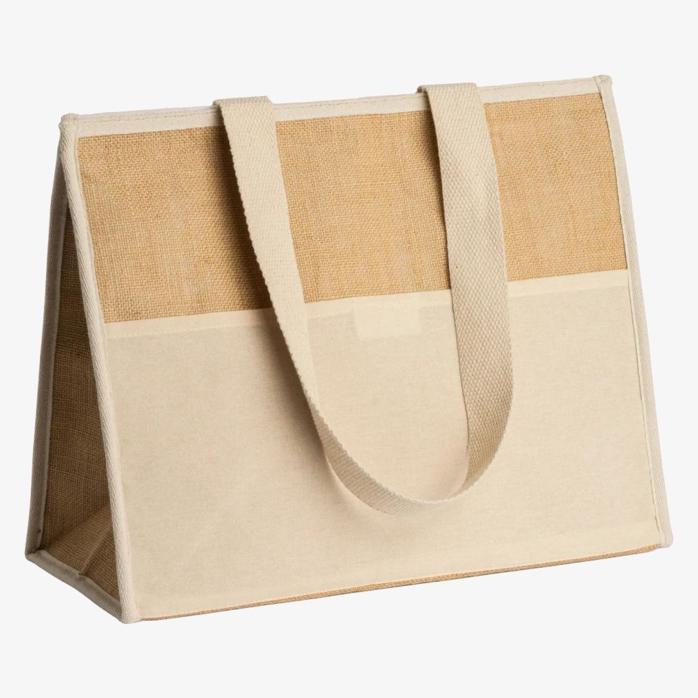 Le sac isotherme en jute laminé dispose d'un intérieur en aluminium isotherme avec fermeture par bande auto agrippante. Il comprend une poche avant et des anses en coton naturel.