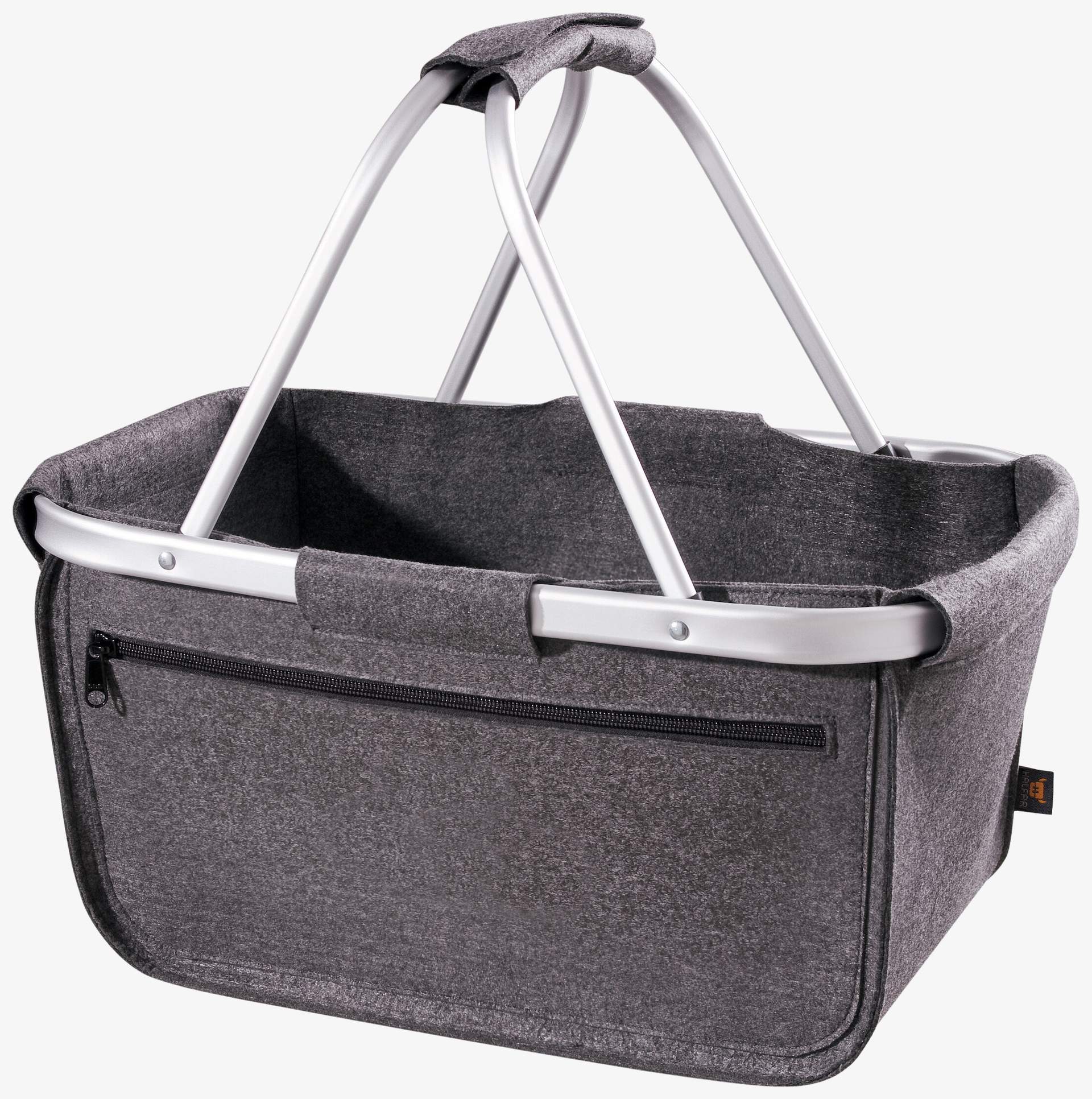 Le Felt Shopper Basket est un panier shopper pliable en feutrine, avec armature en aluminium et poche avant zippée. Dimensions 45 x 25/45 x 25 cm.