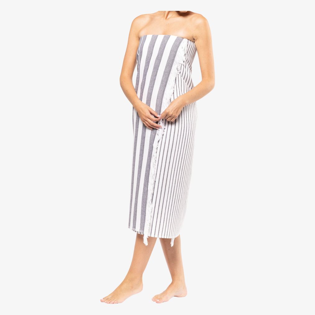 La fouta rayée est une serviette en coton jacquard conçue avec une face tissée et une face éponge qui facilite l'absorption et le séchage. Elle mesure 100 cm x 180 cm.