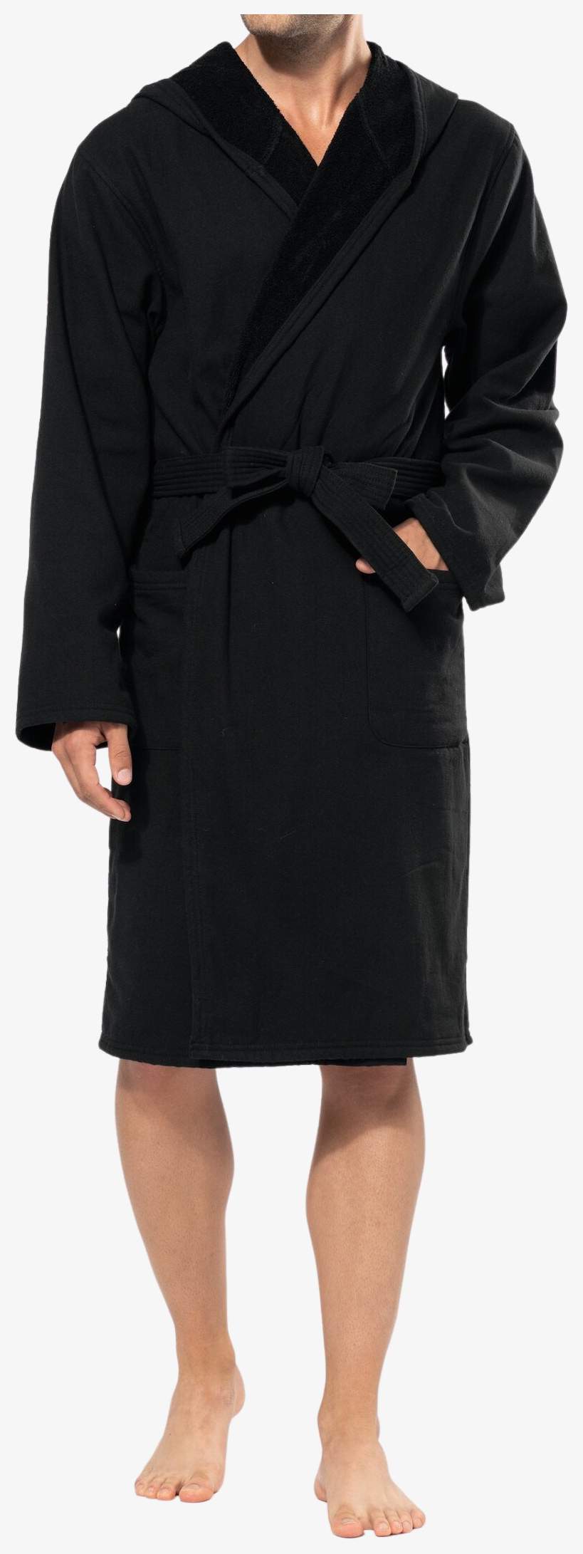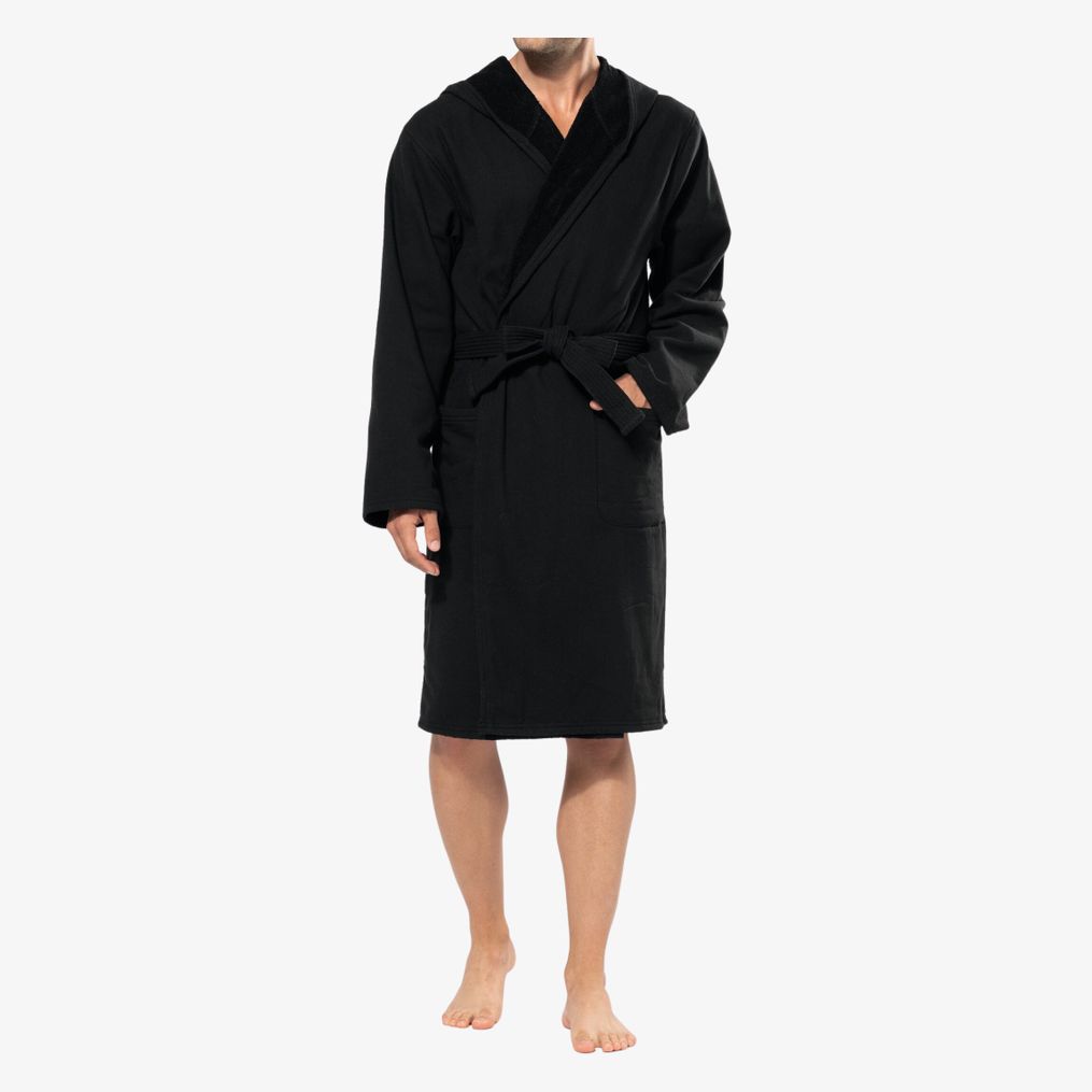 Le peignoir bain à capuche en coton biologique présente une maille terry douce avec une grande capuche et deux poches plaquées avec surpiqûre de renfort en haut. Il comprend une ceinture avec passants et un lien d'accrochage dans le col. Les finitions sont réalisées en double aiguille sur le bord de la capuche, le bas des manches et l'ourlet.