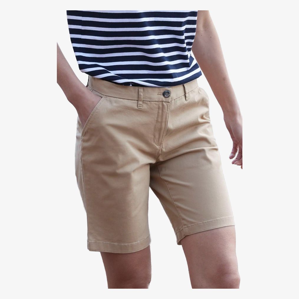 Le short stretch femme est conçu sans pince sur le devant. Il comprend deux poches arrière avec passepoil et des poches avant biais. La fermeture est zippée et la ceinture est munie d'un bouton. La composition est de 97 % coton et 3 % élasthanne.