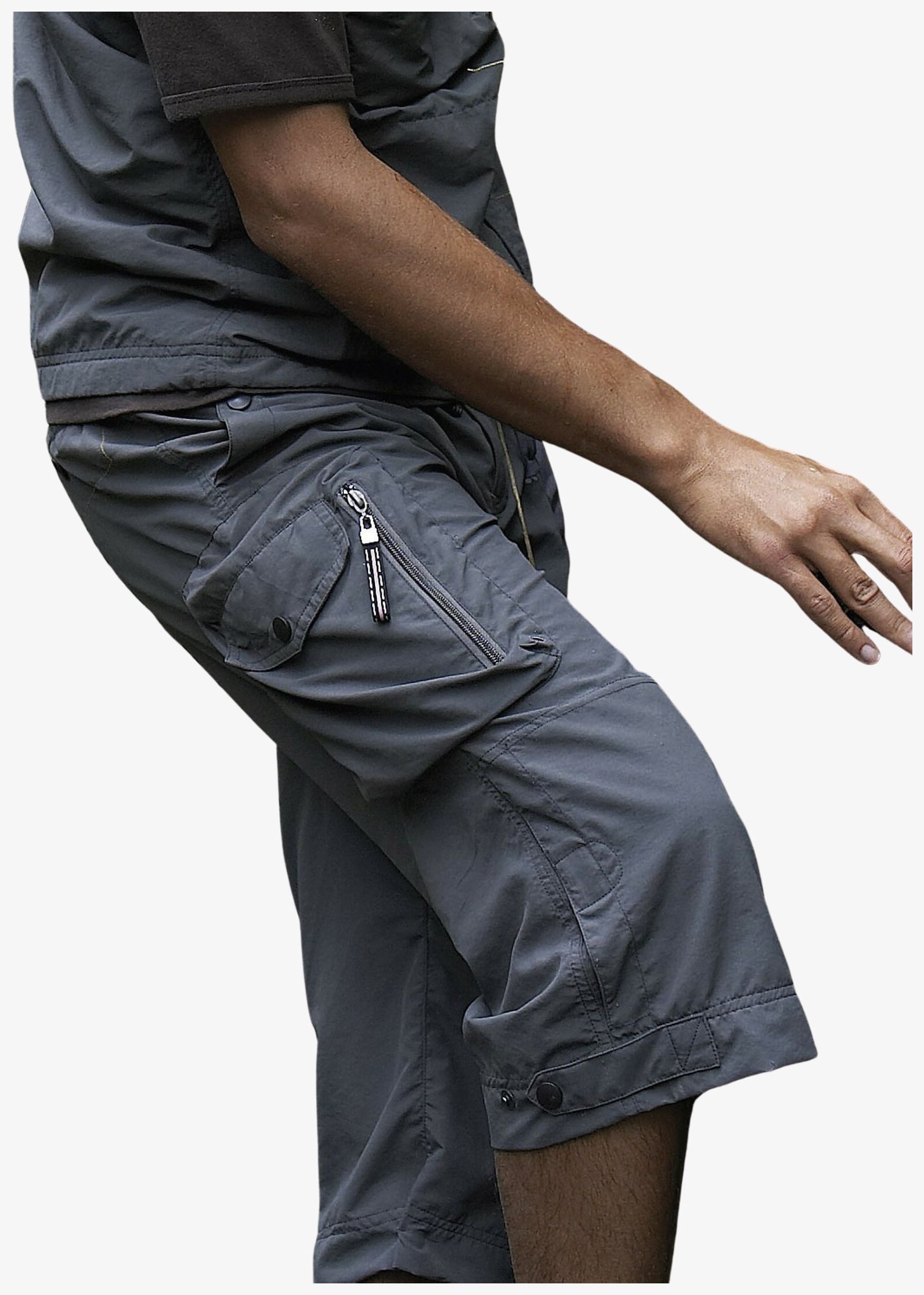 Patte de serrage avec bouton pression à la taille et au bas de jambe. Anneau pour mousqueton.