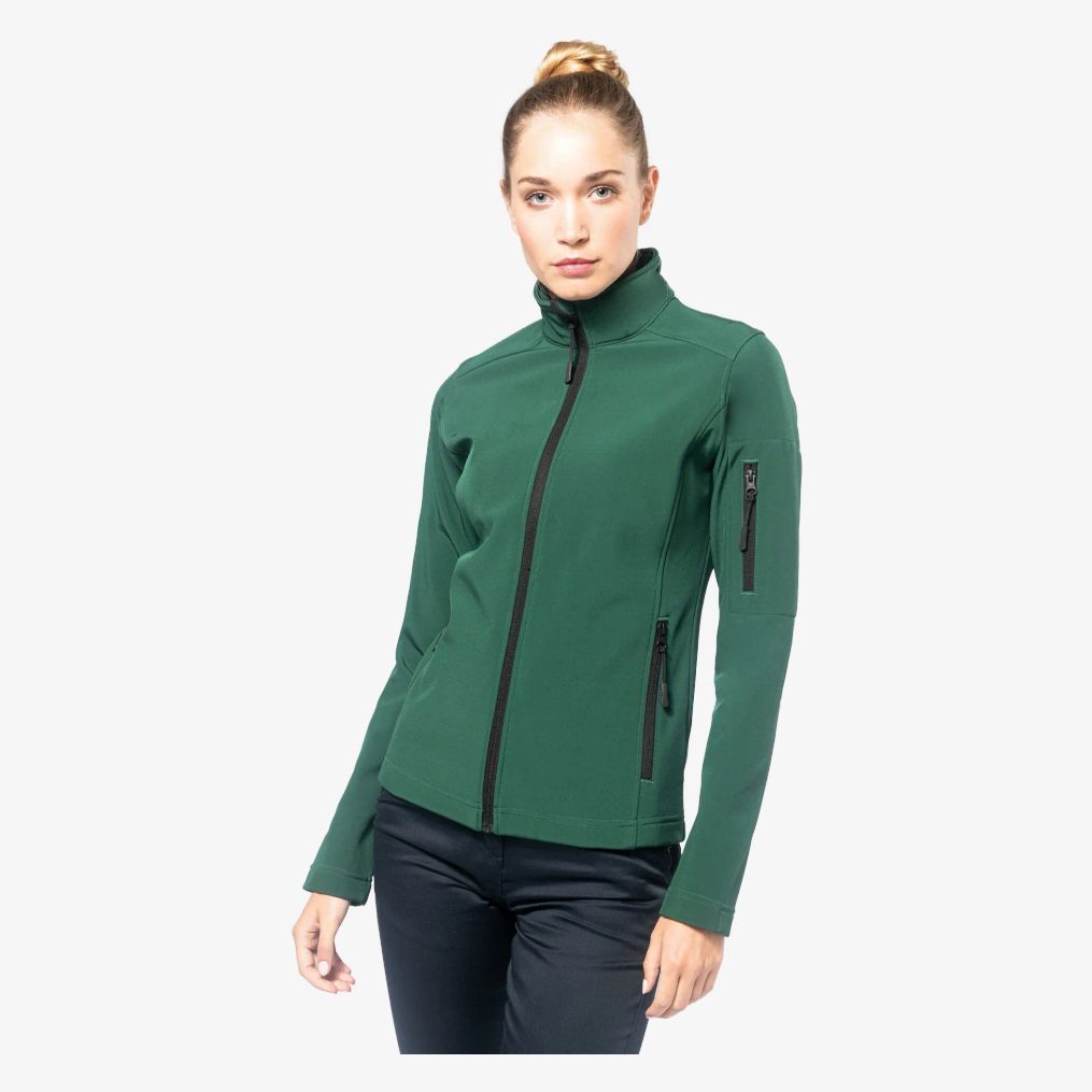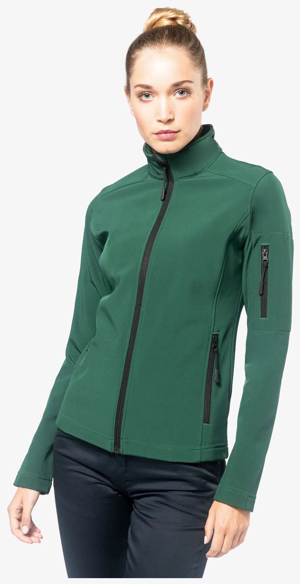 La Veste softshell femme k400 correspond à une softshell 3 couches à coupe cintrée, avec fermeture zippée et poches zippées (devant et manche). Composition : extérieur 95% polyester, 5% élasthanne ; couche intermédiaire membrane respirante ; couche intérieure micropolaire.\n\n- Composition : 95% polyester\n- 5% élasthanne\n- 3 couches contrecollées\n- 3 poches zippées Grammage : 300g/m²