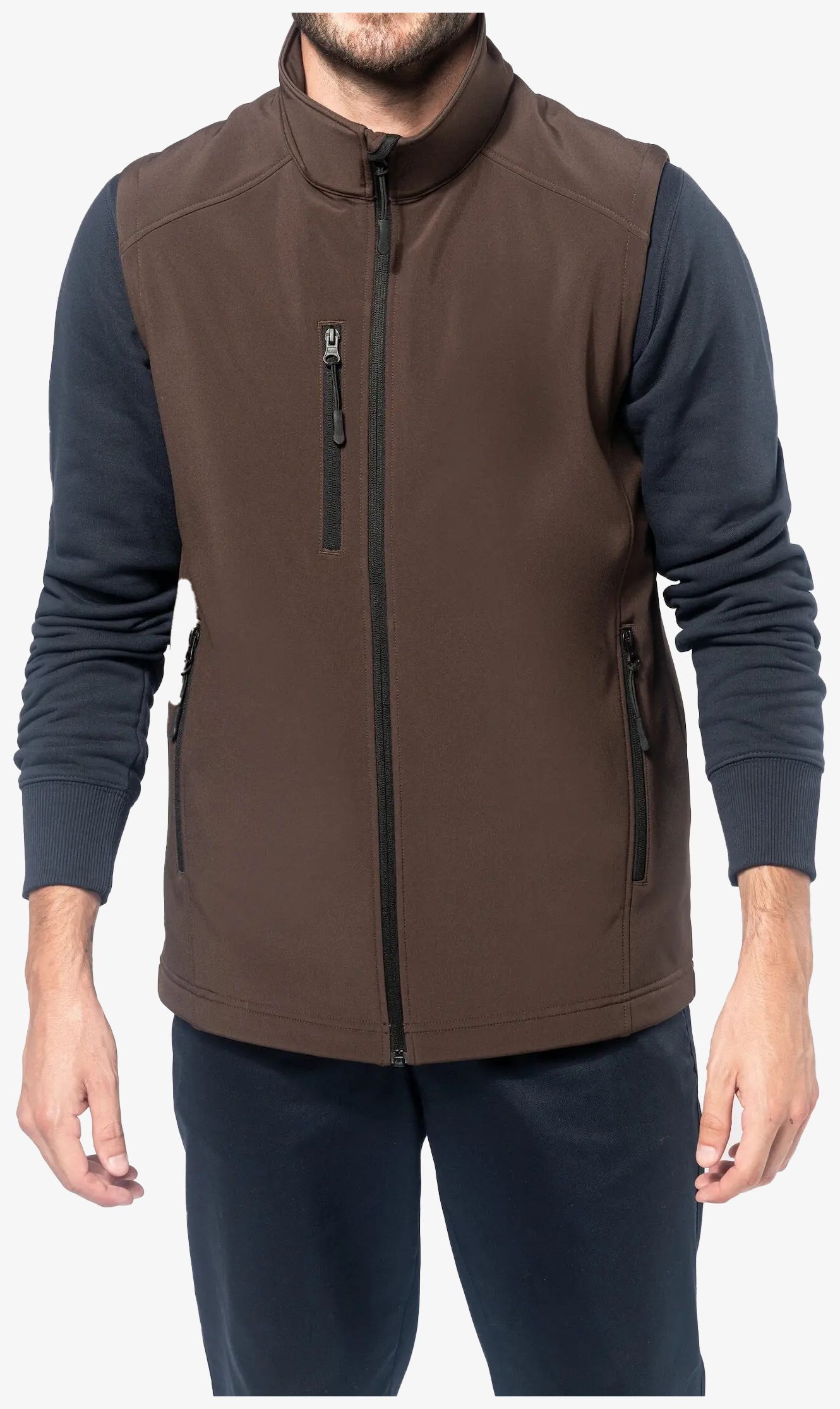 Le Bodywarmer softshell homme k403 correspond à un tissu contrecollé 3 couches, avec fermeture zippée, 2 poches zippées sur le devant et une poche poitrine zippée côté droit.\n\n- Composition 95% polyester 5% élasthanne\n- Couche intermédiaire membrane respirante\n- Couche intérieure micropolaire\n- Tissu contrecollé 3 couches Grammage : 300g/m²