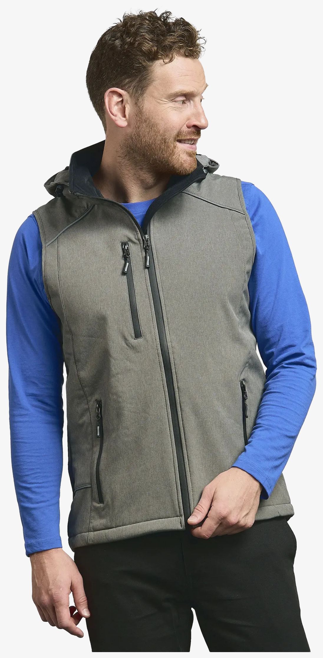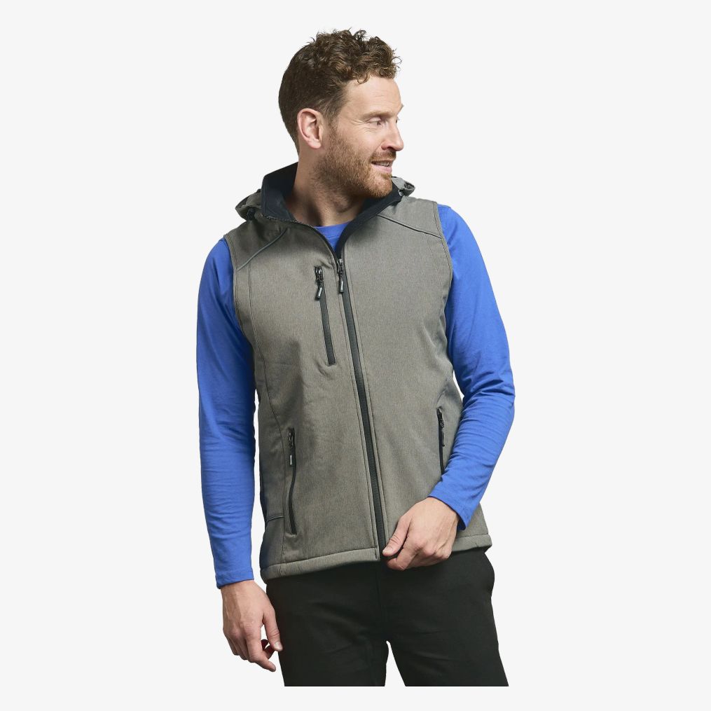 Le Men s Softshell vest est un bodywarmer avec capuche amovible et réglage de volume. Sa coupe avec dos plus long, ourlet incurvé, protège-menton, poches zippées et cordon de serrage à la taille convient à un usage extérieur.