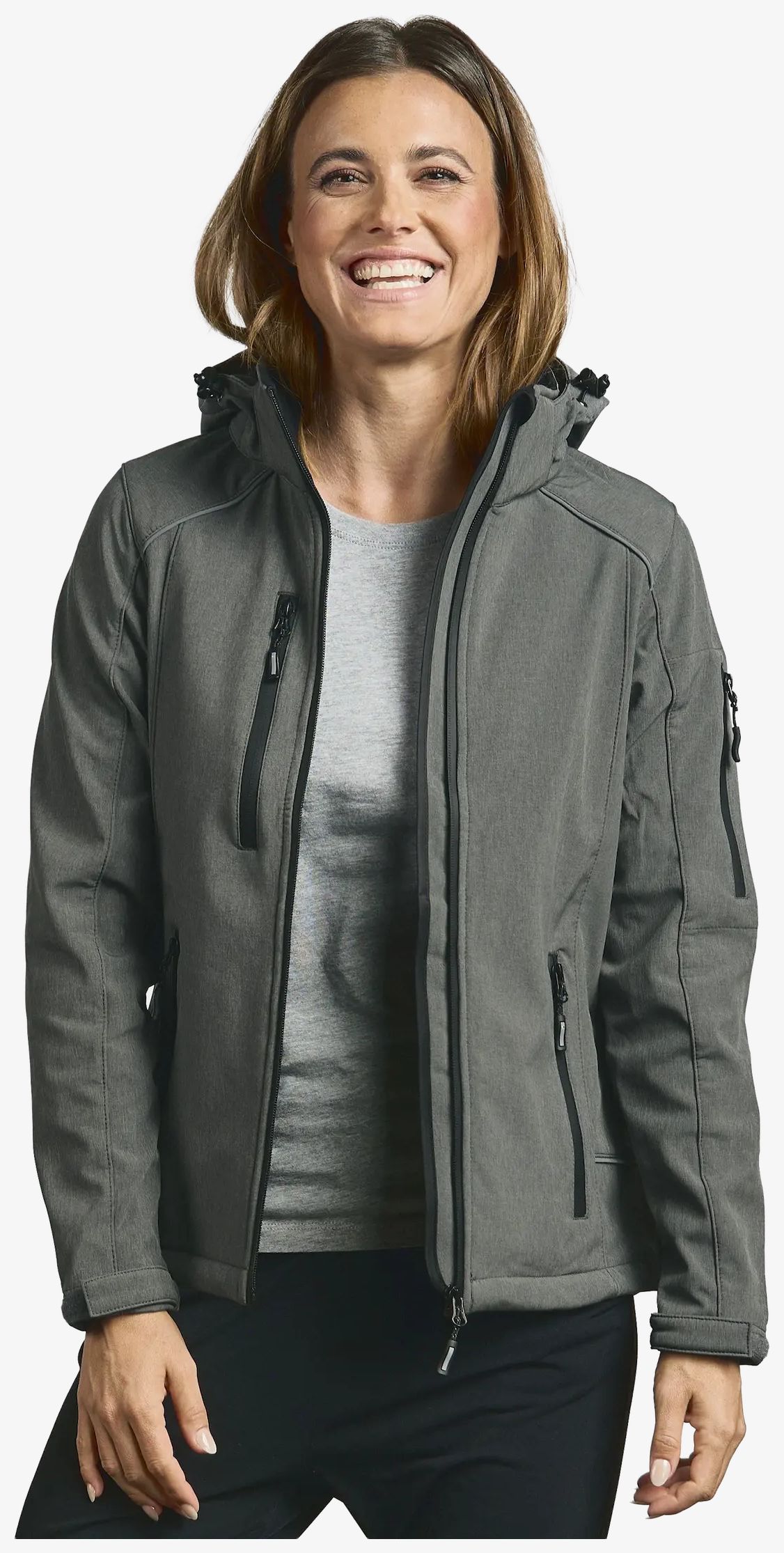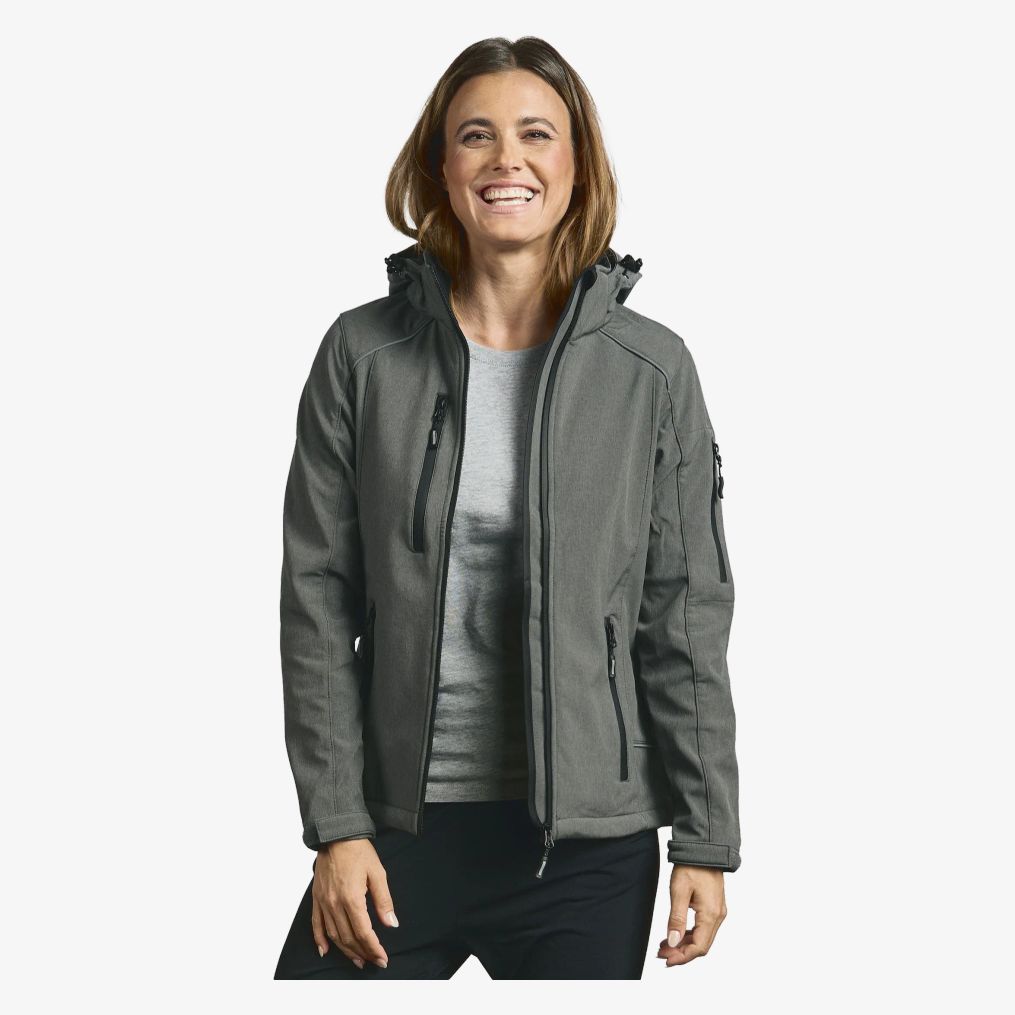 La Women s Softshell Jacket est une veste softshell femme 3 couches avec capuche amovible à réglage de profondeur, fermeture zippée imperméable, protège-menton, poches zippées et dos plus long. Les poignets se règlent par bande auto-agrippante et la taille par cordon pour un ajustement simple.