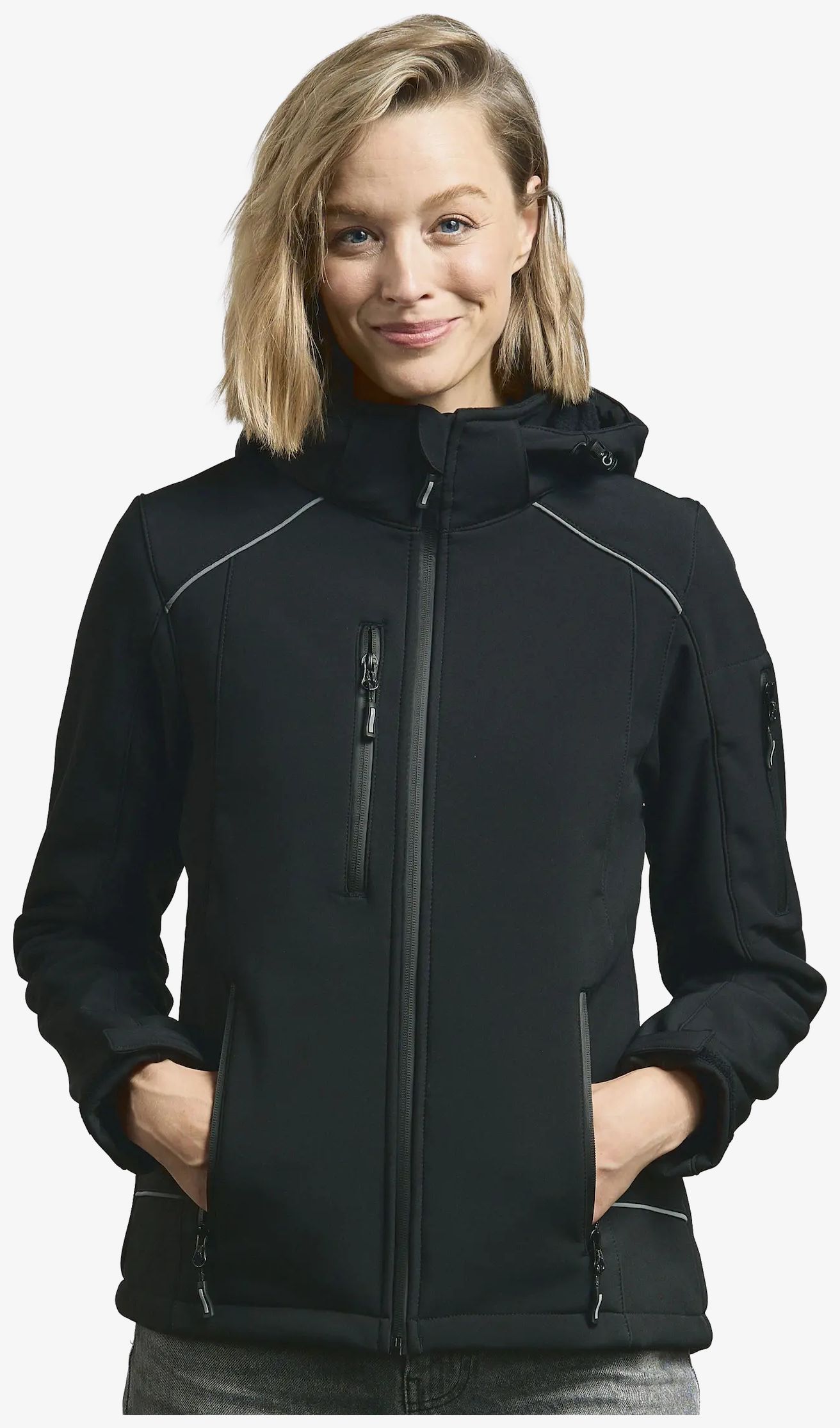La Softshell Femme est une veste femme conçue pour les usages extérieurs, avec capuche amovible, poignets ajustables, cordon de serrage à la taille, dos plus long et poches zippées, dont une poche poitrine et une poche manche. La coupe couvre davantage le bas du dos et les éléments réfléchissants améliorent la visibilité.