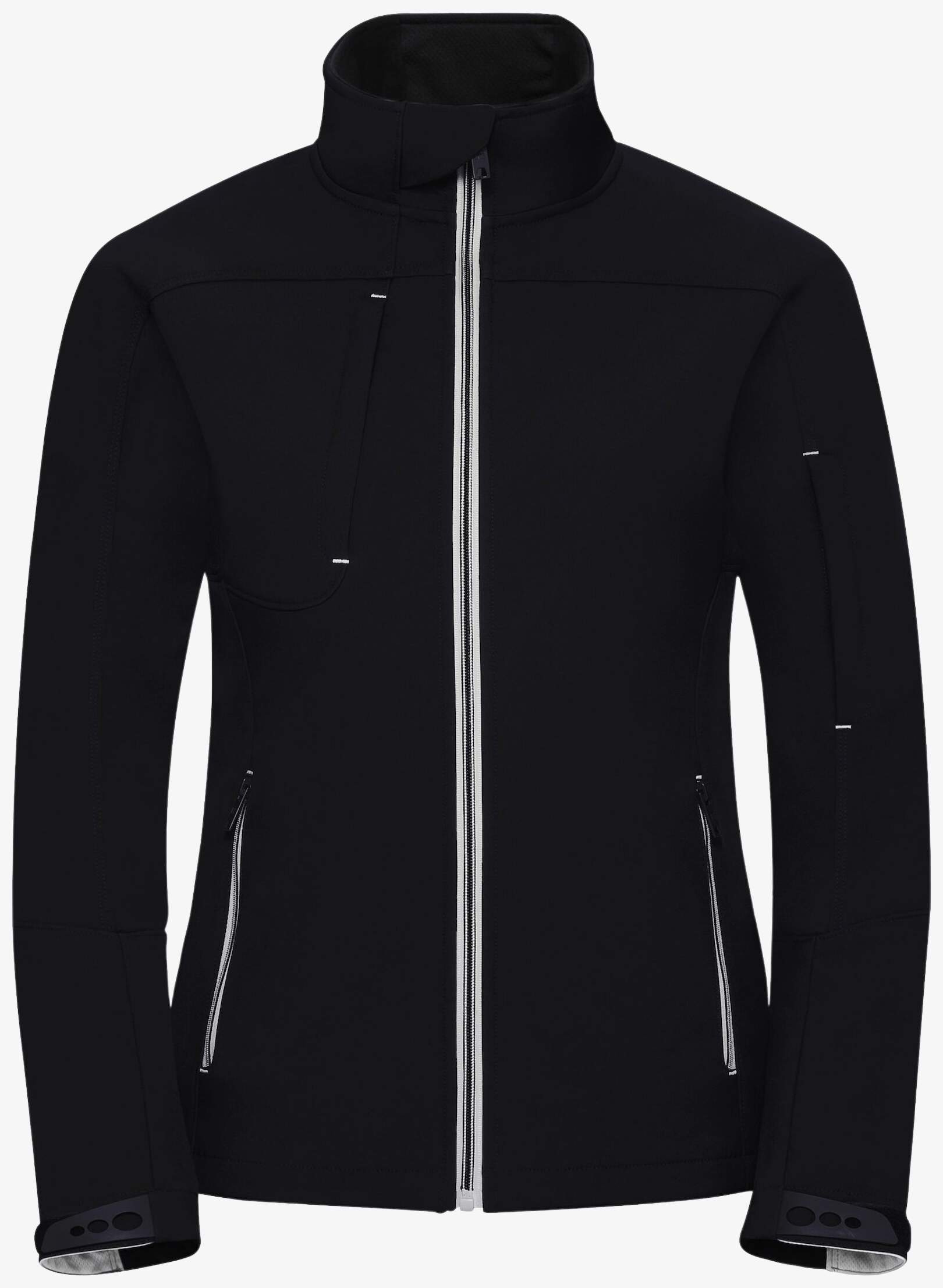 La softshell ajustée en polyester combine une coupe proche du corps avec plusieurs poches zippées dont une sur la poitrine et une sur la manche. Elle intègre un protège-menton et des poignets ajustables. La finition BIONIC-FINISH Eco apporte un traitement spécifique.