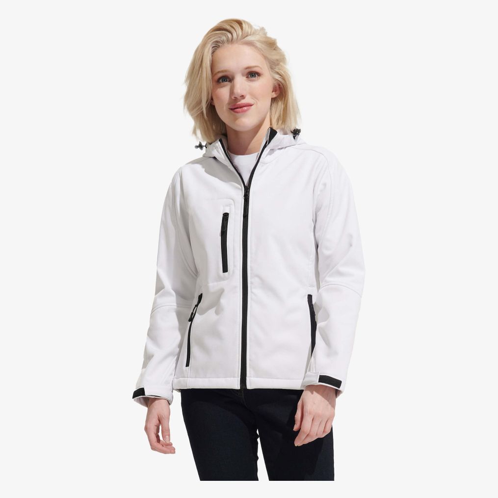 La Replay women softshell femme 46802 à capuche, construction 3 couches, avec membrane TPU 8000 mm. Extérieur 94% polyester et 6% élasthanne, intérieur polaire 100% polyester avec face micro-polaire. Poches zippées, réglage à la taille et aux poignets.
